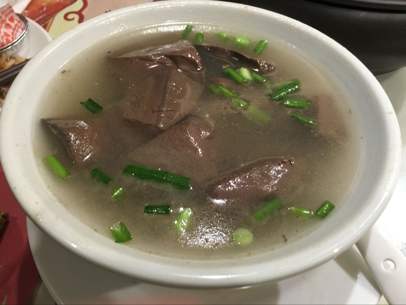 猪肝面里的猪肝煎的非常嫩,咬下去似乎有汁水,绵软香浓没有丝毫的腥气,与我们平时吃的难以下咽的硬猪肝一点儿也不一样。面条细细的,是你们喜欢的那种方便面的口感,但是明显更滑更健康一些。
