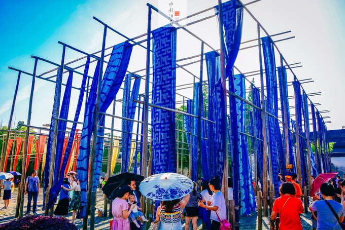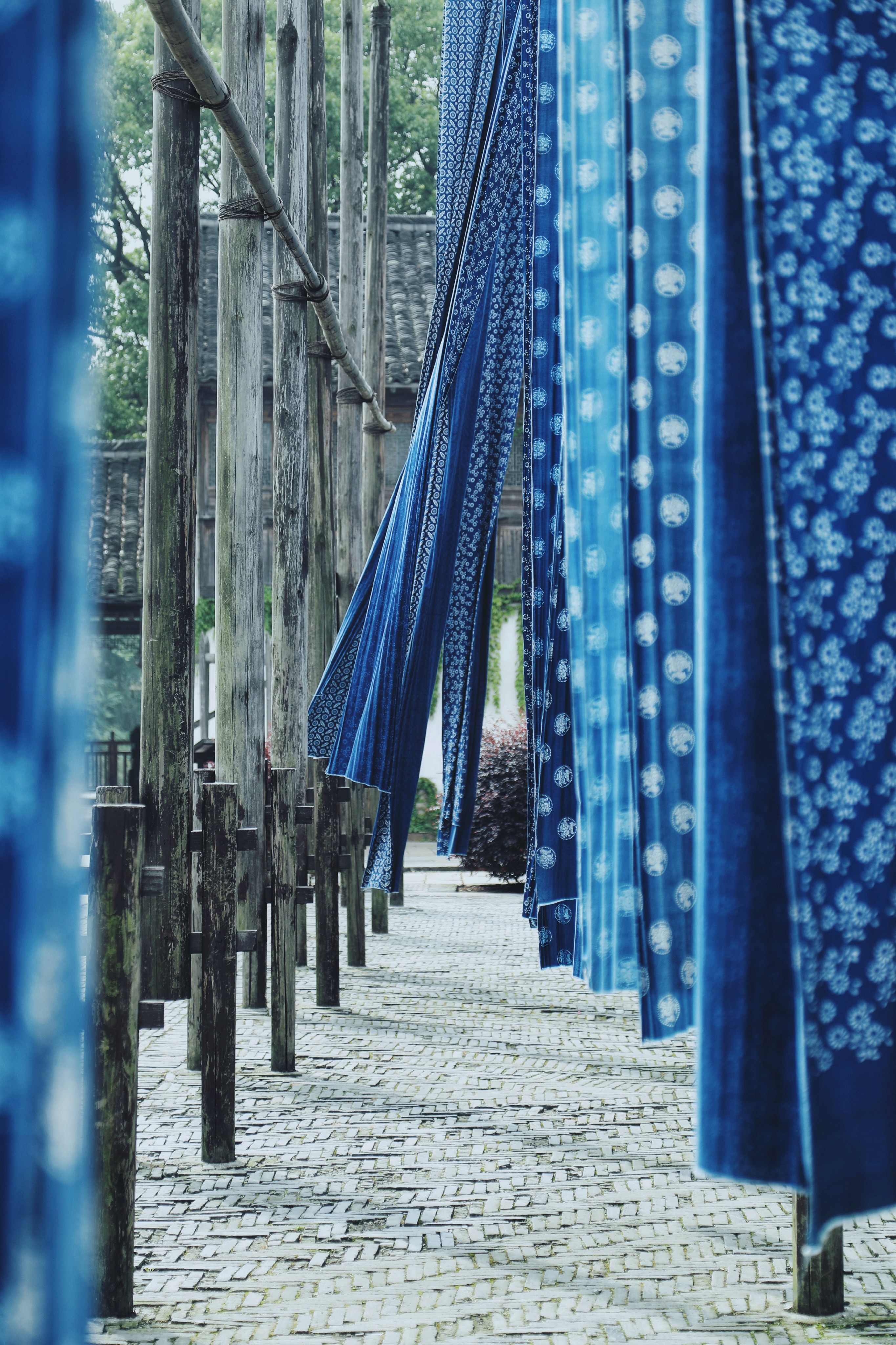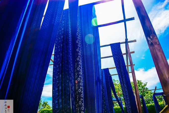 宏源泰染坊,始于宋代,东栅蓝印花布制作基地,是必游景点之一。 蓝色的布匹随风飘动,十分唯美,上面的印花纹理别有韵味。