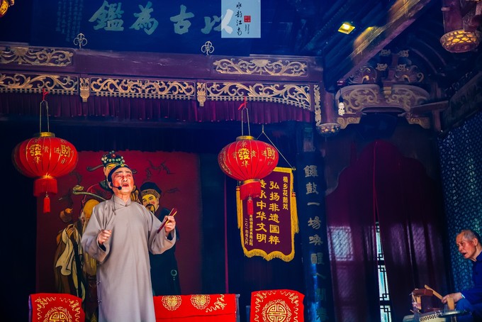 修真馆前的广场戏台上,每天固定时间有戏曲表演。