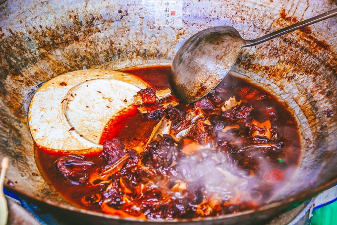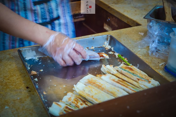 步行街的尾部区域,各色美食云集,各色当地小吃和不同档次的餐馆随处可见。图上是葱包烩。