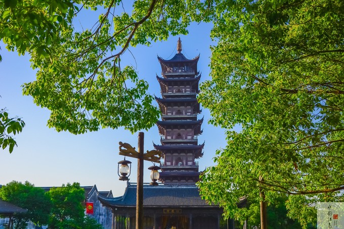 最尽头的水域即是京杭大运河流经的地方,白莲寺中的高塔颇为引人注目。