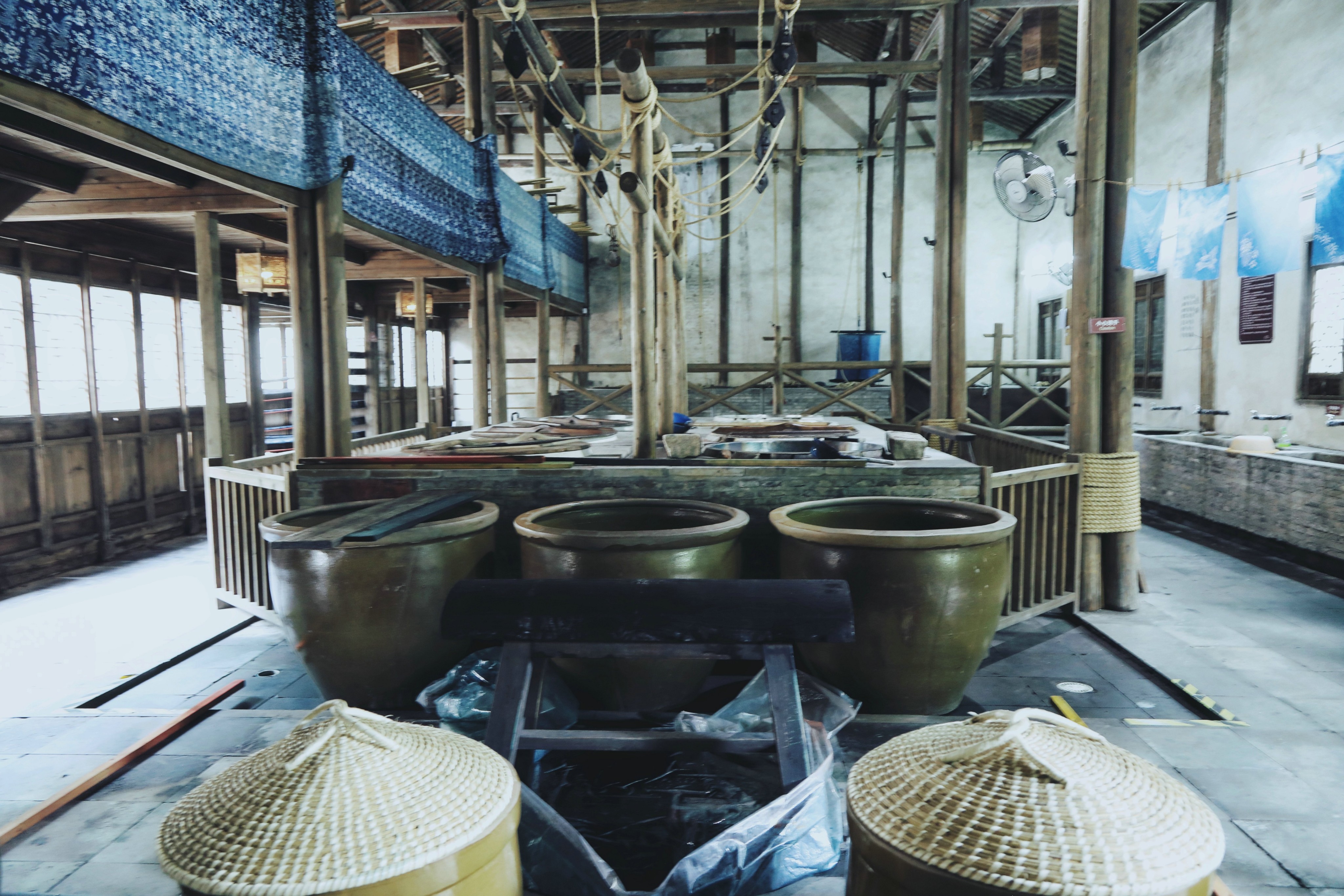 大多数游客抵达西栅后的第一个景点,应该都是草木本色染坊,大小规模与宏源染色坊不相上下,布匹的颜色还多了红色和黄色等。