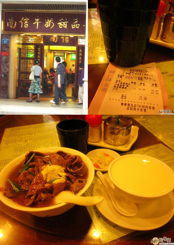 在陈添记喝了碗粥,走了一会儿就消化掉了,看到了南信牛奶甜品店,我又进去接着吃了,哈哈~既然是“甜品专家”,所以必须点道甜品啊,正宗姜撞奶比较少能吃到,所以点了姜撞奶,但是我忘记了我不喜欢生姜这件事,所以上来试了一口后我就发现,我不太能接受,这家店的甜品有冷有热的,我没有和收营员说,所以直接上的热品,这样就会导致姜味十分浓郁,后悔啊,该要个冷品的~还点了碗牛,也就是牛的内脏之类的,可以在牛里加粉或是面,跟收银员说清楚就行了。据说这家生意很好,人也挺多的,还好我是周一早上去的,大家都去上班了,所以人有空位,不需要排队。