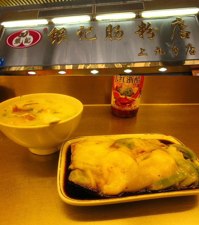 连吃了三家,这回是真的吃饱了,所以就开始逛逛逛模式!后来逛饿了,就去了银记肠粉店!当时应该正值广交会,虽然不是节假日,街上人也挺多的,银记里也满满的都是人,我点了鲜虾肠和艇仔粥。这家店是叫号制的,但是店员叫号用的都是话,我听不太懂,所以就一直盯着店员手里举着的牌子看是不是到我了。后来有一的哥们,实在是听不懂他们说的话,就对店员说能说普通话么?所以那天结果就变成了,店员叫号,先用一遍普通话再用一遍话。