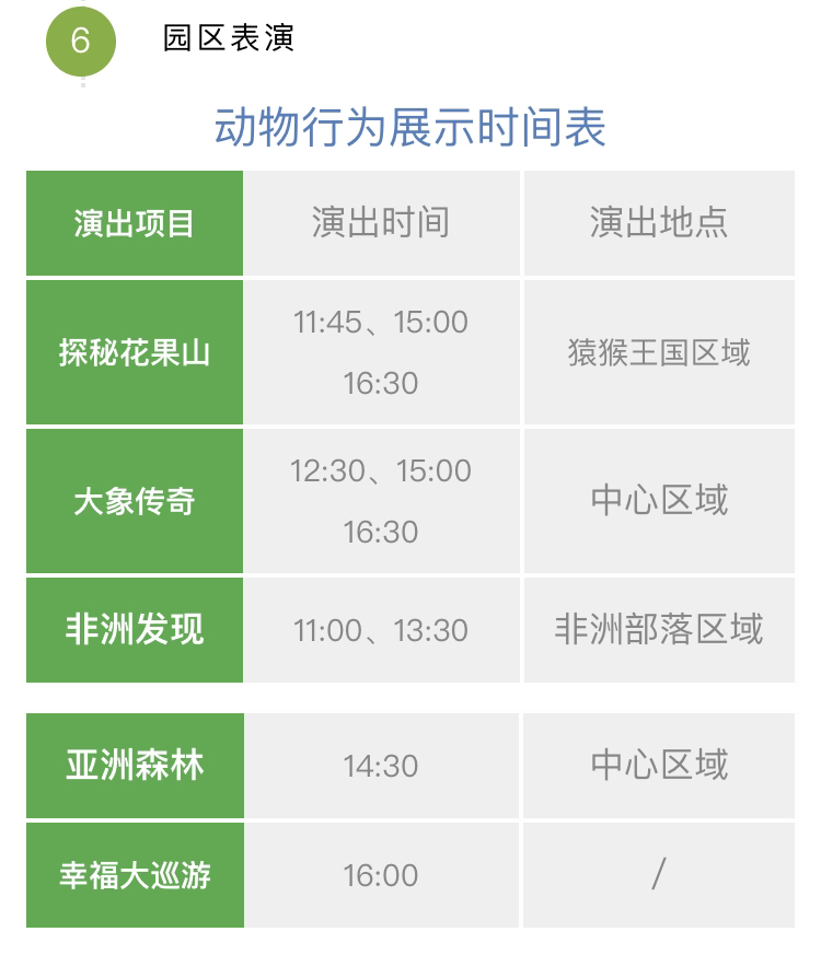@蕉蕉:大象剧场【12:30 14:15(周六、日) 17:00】 花果山剧场【11:00 12:30(周六、日) 15:45】 长隆方舟剧场【13:15(周六、日) 15:00】 河马剧场【11:45 14:15(周六、日) 16:15】 白虎跳水 周一至四10:30-17:30 (每30分钟一场) 周五10:30-17:00 ( 每30分钟一场) 周末10:30-18:00 (每30分钟一场)