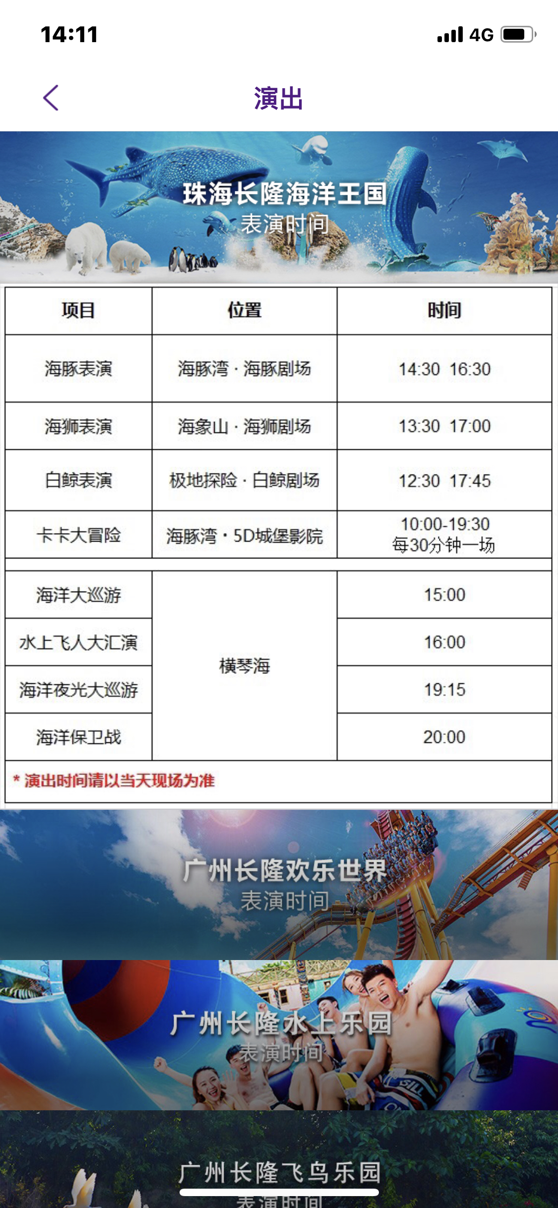 长隆有一个微信公众号,关注以后里面有每天的表演时间和场次,很方便。========== 如果你觉得TA的回答不错,快来给TA点个赞吧! 你的支持是对作者莫大的鼓励~显示全部