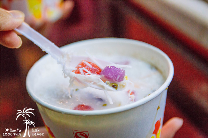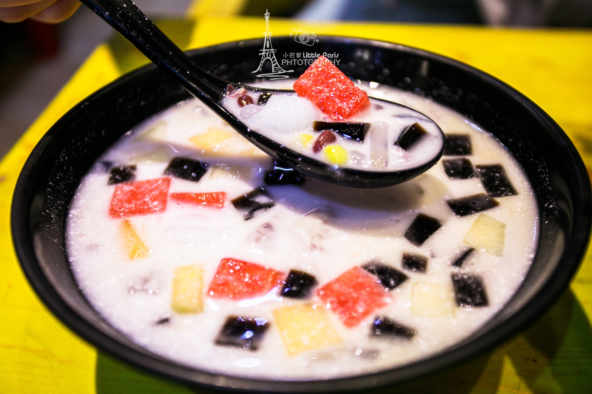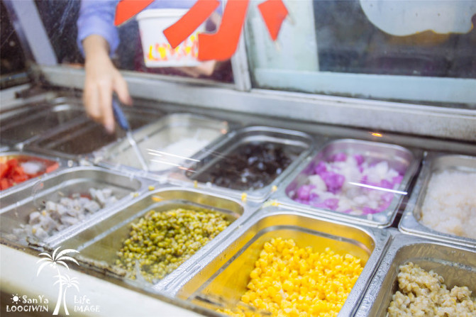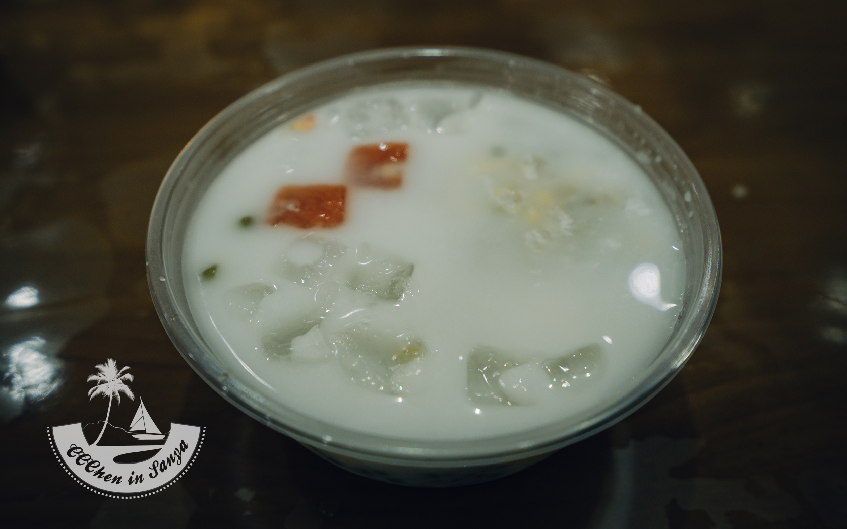 7.清补凉这是我最最喜欢的甜品,每天必吃。清补凉以椰奶汁为底,里面可以加非常多料,像红豆、绿豆、西瓜、芋头、凉粉、空心粉、木耳花、红枣……当地人都是早上准备好一天的配料,客人要什么就加什么,所以白天可以加的料更多,晚上只能加剩下的,卖不完的料都是当天处理掉。