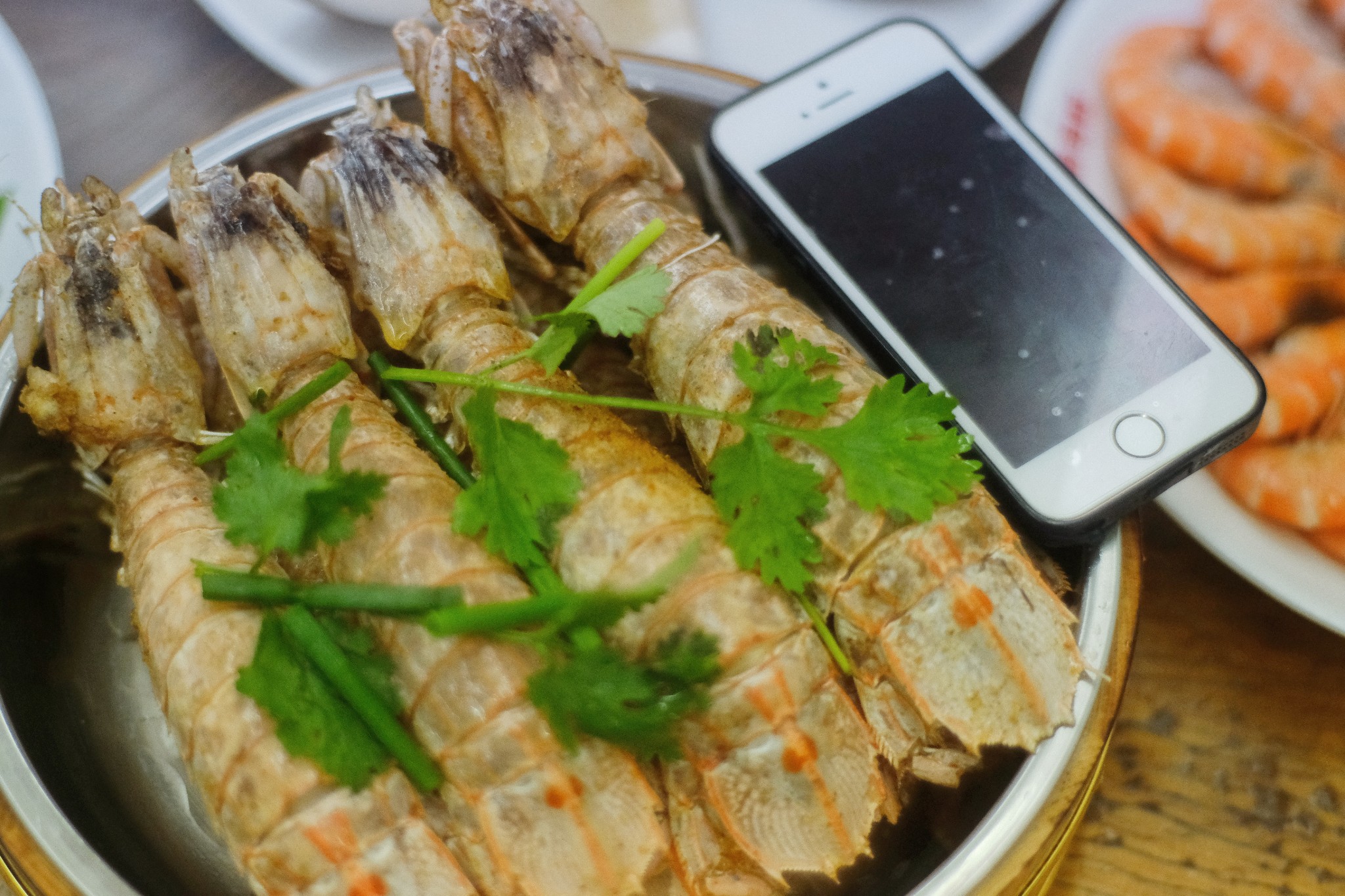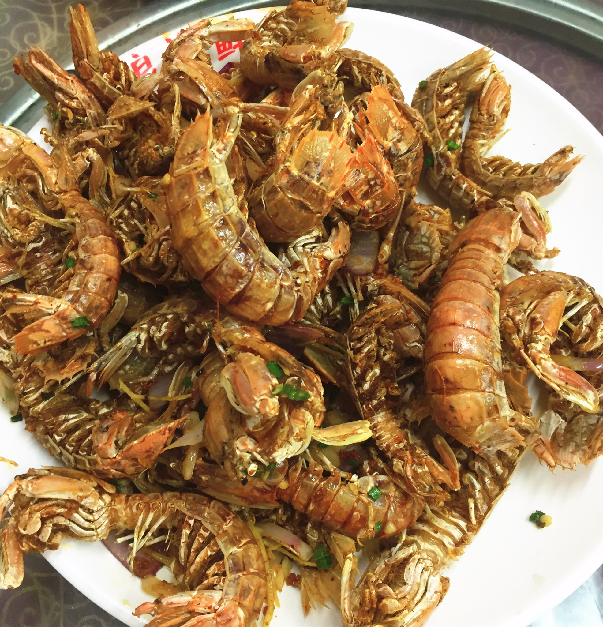 而自从皮皮虾跟我走的段子横空出世以来,濑尿虾也火速走红大 江南 北!老板娘为我们挑了比手机还大的濑尿虾,用椒盐的做法,喷香垂涎!不过要注意不能舔吮虾壳啊,濑尿虾是有倒刺的,很容易刮破唇舌,所以剥虾也是有技巧。