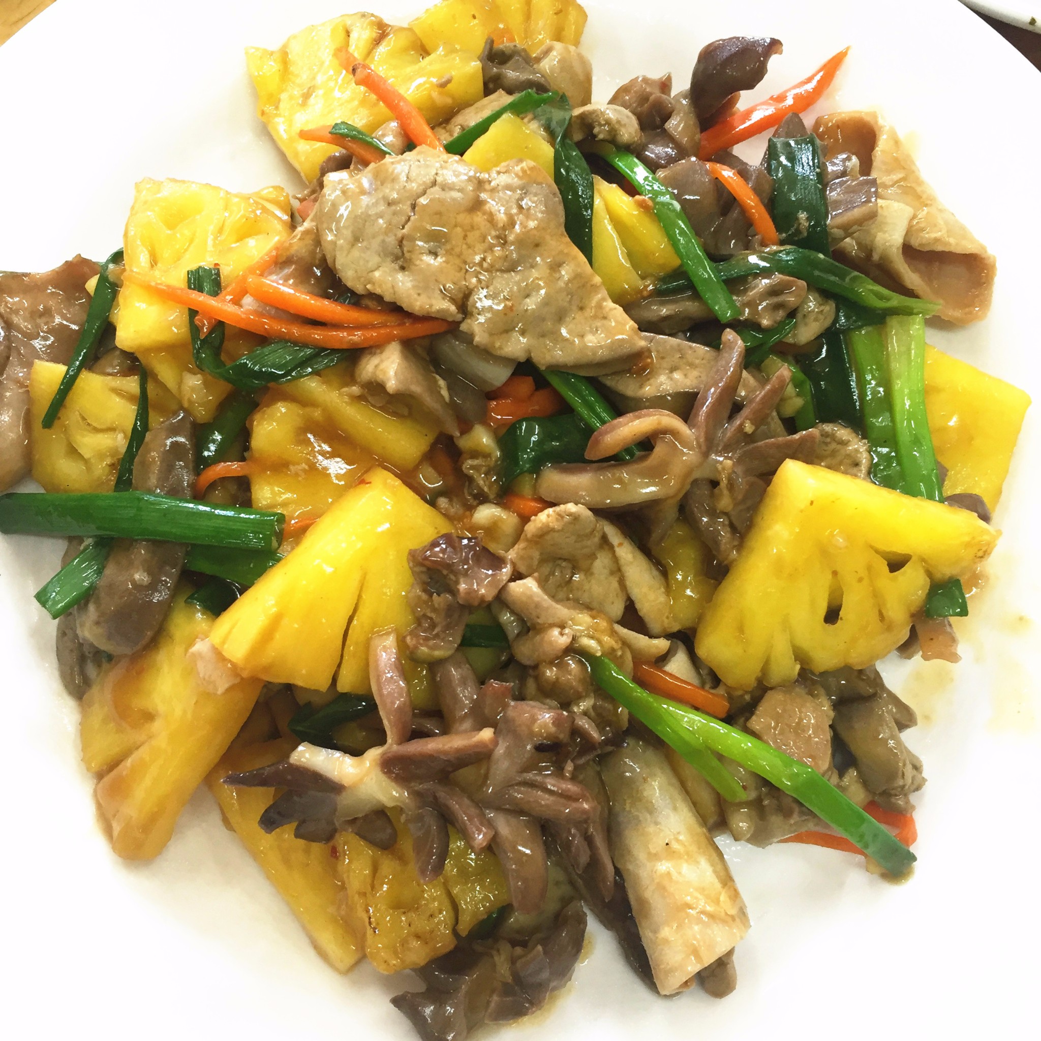 菠萝炒牛肉。 海南 本地产的小黄牛肉,鲜香中带有韧性,菠萝中特含的一种酶类物质,能分解肉类中的蛋白质,使牛肉质感更加嫩滑,又带有菠萝的鲜酸香味,很是开胃咸鱼茄子煲