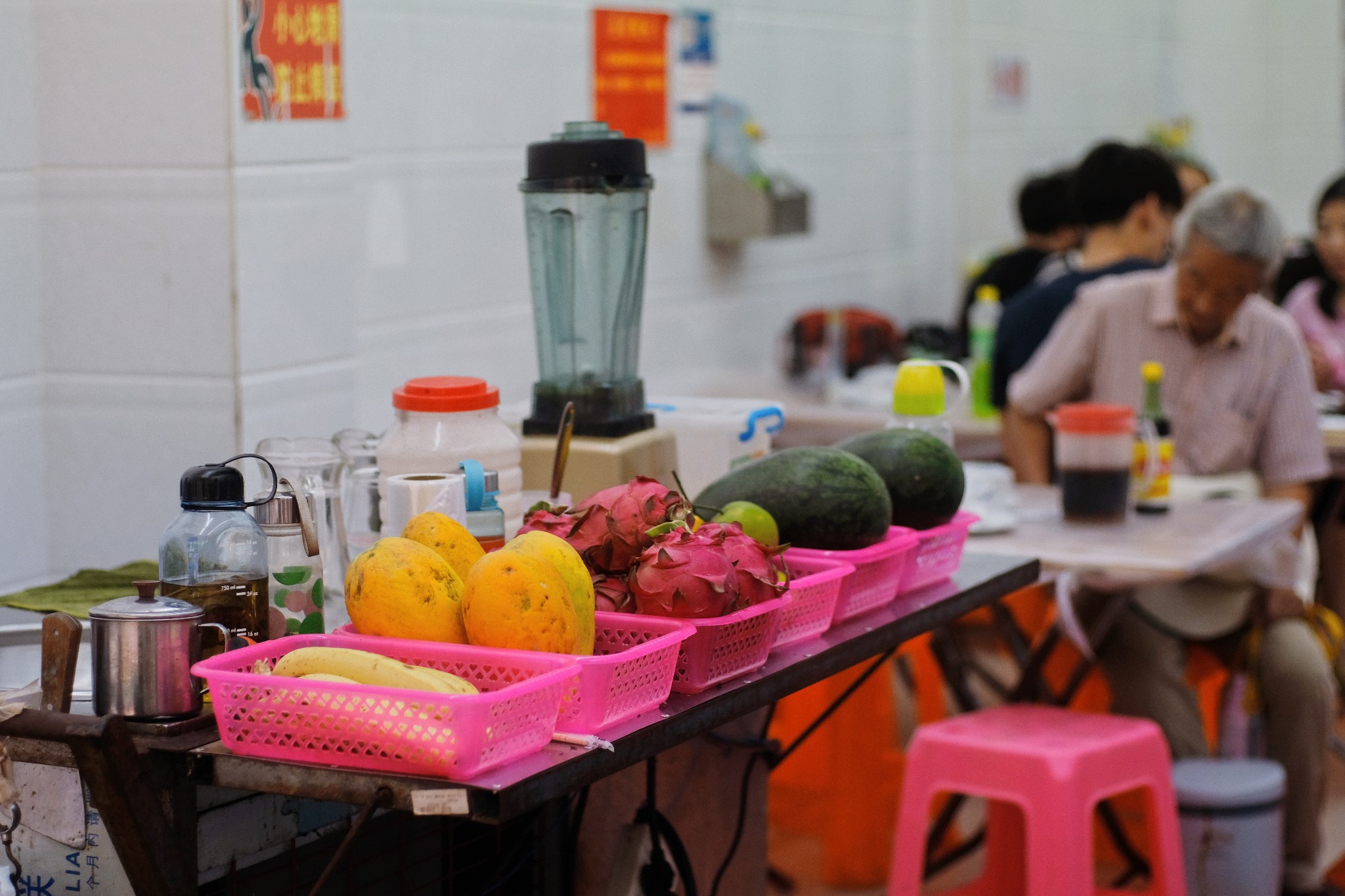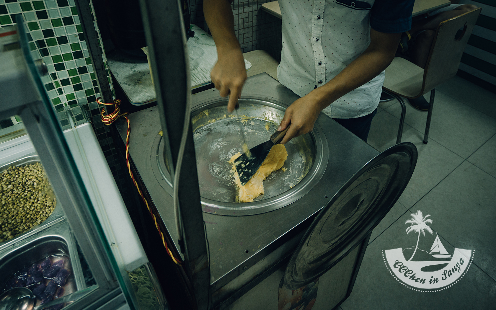 说完了 海南 粉,再说下图的腌生面,也叫做腌伊面。看上去和 海南 粉别无二致,因为配料和卤汁是一样的,区别在于基质。 海南 粉的基质是米粉,而腌伊面是用一种面条做的,这种面是油炸的鸡蛋面,形状也很细,但口感上比 海南 粉要韧一些 鲜榨果汁炒冰果汁和炒冰,本来是两种东西,在这里却是同一种物质的两种状态,还可以相互转换。秘诀就在于这个机器:炒冰机。锅下面不是火,而是一种强力制冷的机器,使温度瞬间降到零下40摄氏度左右,把液体倒在锅里,用木铲不停地翻动,液体受冷逐渐粘稠成为冰泥。在第一市场,炒冰随处可见。 天气长期炎热,加之热带水果出产众多,水果炒冰也就应运而生。越是本土味正宗的小吃,位置往往越是低调。这家店隐匿于一家巷子,虽然距离 市区的主干道很近,但却在很窄的支路上。店内环境却十分雅致,这样的环境在小吃店中还是不多见的地址:外贸路四巷15号。巷香聚 海南 粉。位置不是太好找。一般是先到知名度很大的吉祥街,找到吉祥街和铁道中路(俗称老火车道)的交叉,这里就非常接近了。问一下路“外贸路四巷”,从巷口直走即到 鲜榨果汁炒冰果汁和炒冰,本来是两种东西,在这里却是同一种物质的两种状态,还可以相互转换。秘诀就在于这个机器:炒冰机。锅下面不是火,而是一种强力制冷的机器,使温度瞬间降到零下40摄氏度左右,把液体倒在锅里,用木铲不停地翻动,液体受冷逐渐粘稠成为冰泥。在第一市场,炒冰随处可见。 天气长期炎热,加之热带水果出产众多,水果炒冰也就应运而生。