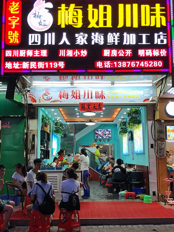 买好了海鲜,在第一市场的背后,就是海鲜加工一条街,很多拉客的小妹,凸显着竞争的激烈,但整条街上永运都会排队的一家肯定是开了二十年的 四川 小胡子,这家店是整个唯一一家直接在厨房装摄像头,直播在门口电视大屏幕上供客人和路过的行人直接观看和监督的海鲜店。相比于在门口放宣传片,这样直接展示厨房的做法,更值得让人信赖。