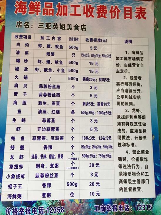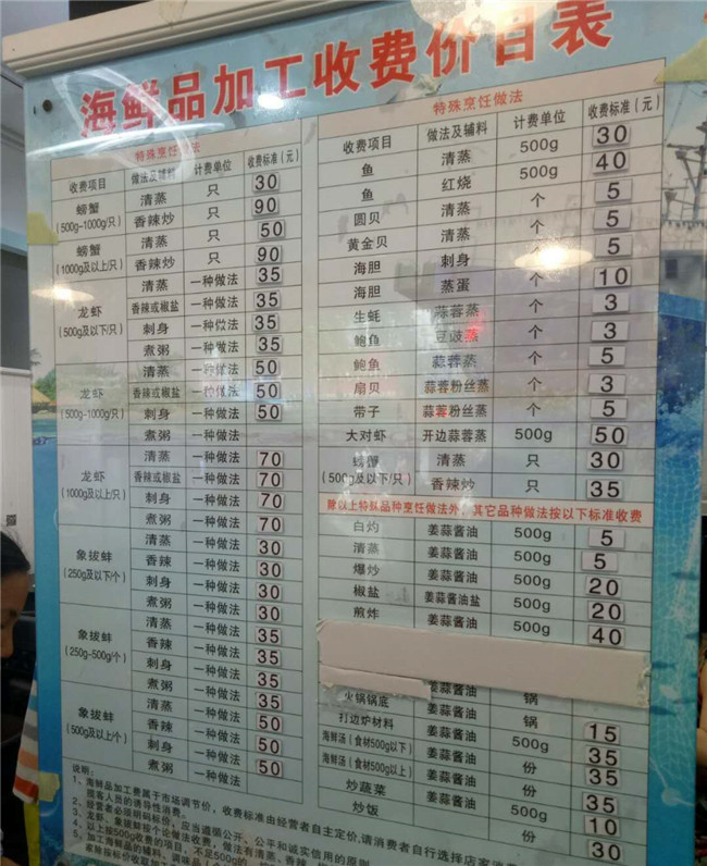 买好了海鲜回店里就开始登记加工费,所有海鲜的加工价格被印刷在店门口的大幅海报上,整条海鲜街都被工商局统一了价格,节假日不能涨价,既然价格相同,当然要选味道更好的