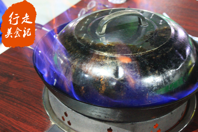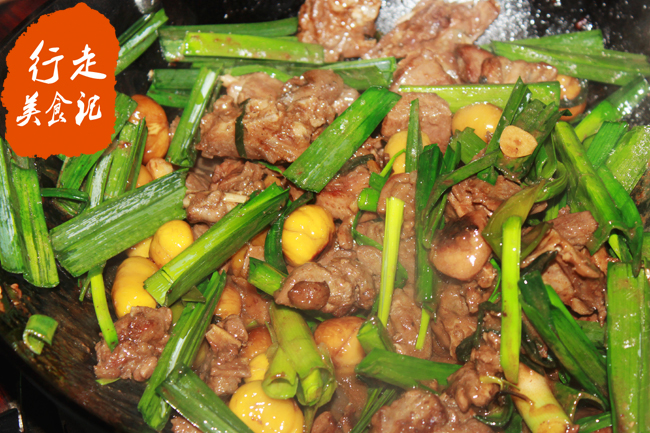 等米酒燃烧完以后,酱汁已经和鹅肉融合得比较均匀了。这时候还需要翻炒一下,让酱汁更入味。每个桌子都会配一碗骨汤,每隔一段时间便往锅 里加 一两勺接着焖煮,让鹅肉充分熟透同时让酱汁充分渗入鹅肉当中。我们点的是半只鹅,焖煮大约七分钟后就可以开吃了 火焰将米酒的香味迅速渗入到鹅肉当中,局部稍微有一点点焦底,反而使口感更为诱人。色泽褐中带红,酱香十分浓郁,与韧性十足的鹅肉浑然天成。一般来讲,干煸的鹅肉已经带有酱汁,可以不用另外用蘸料,但依然可以根据自己的口味搭配蘸料,店家提供的蘸料有蒜泥、生抽、香菜、小米椒、 小金桔等 在鹅肉焖煮之后,再加配菜。配菜是根据自己的喜好令点的。除了菜叶类蔬菜(皇帝菜、生菜),淀粉类蔬菜(板栗、土豆、芋头),还有牛肉丸、豆腐之类的,选择很多。我们点的是板栗和蒜苗,荤素搭配,配色也很漂亮