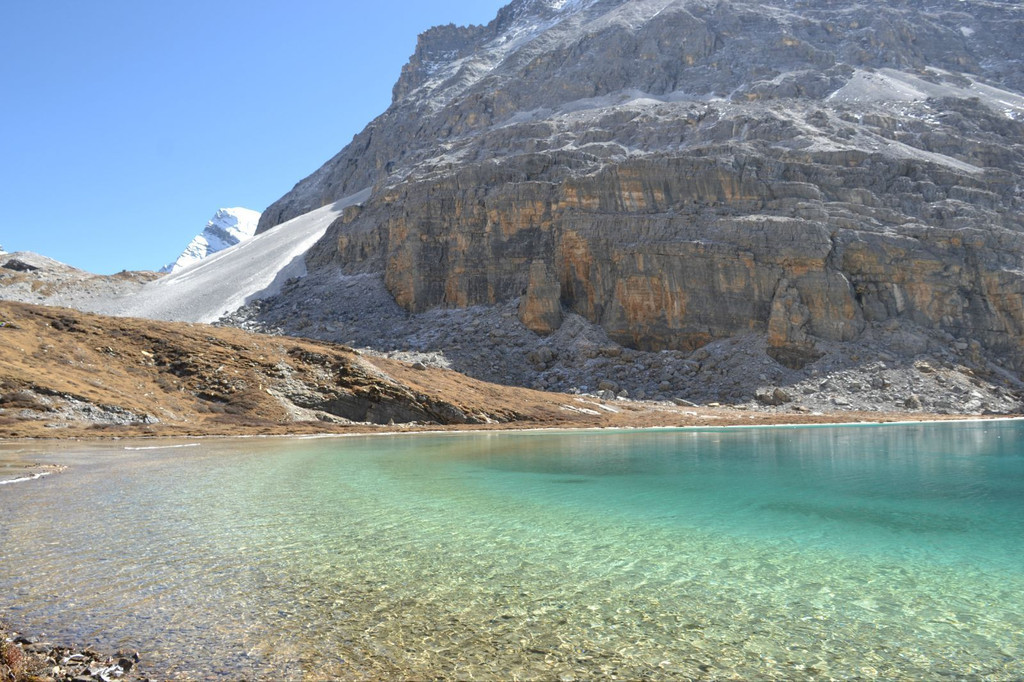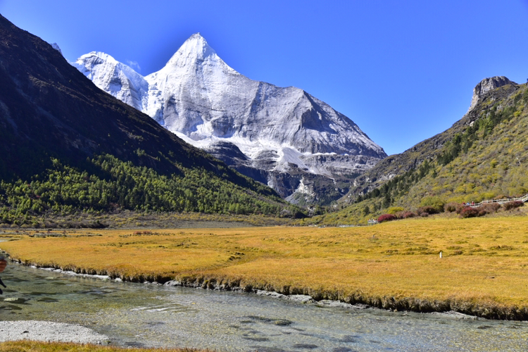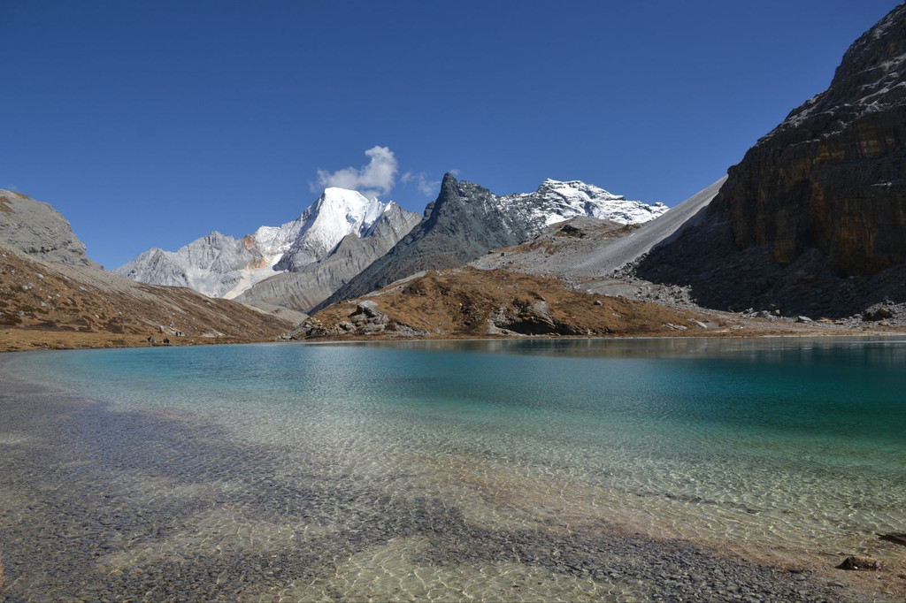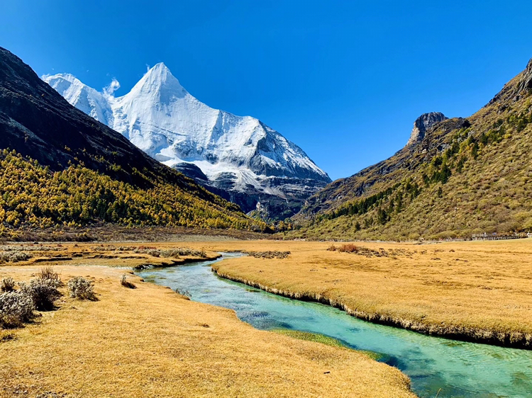 不同季节不同风景吧,我2019年11月份去过一次,那时候是秋季,一片金黄,陪着蓝天白云,碧绿的湖水和雪山,风景特别美