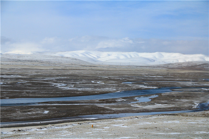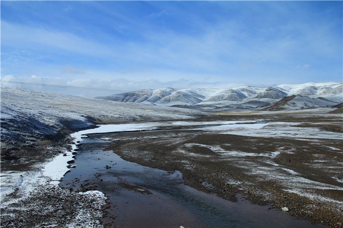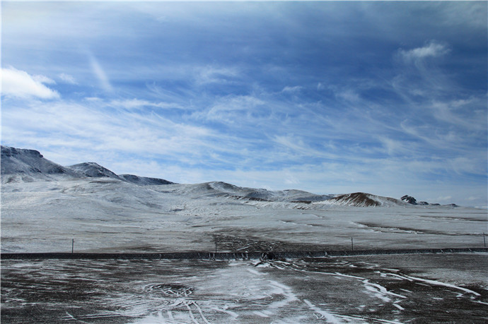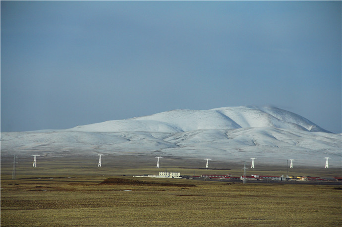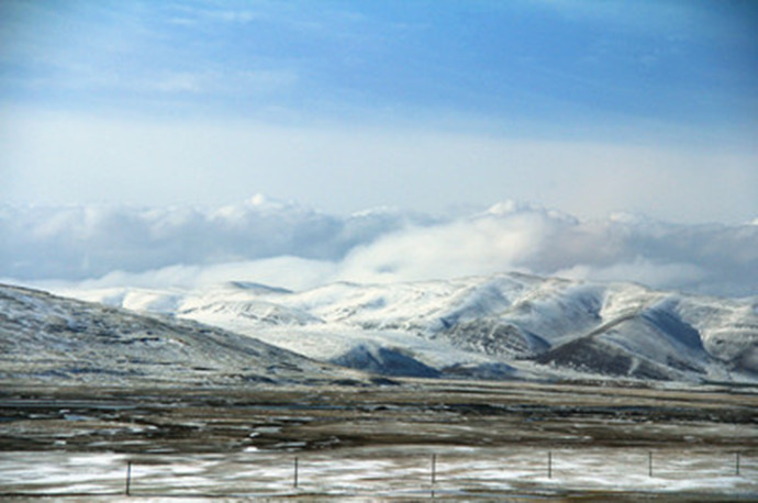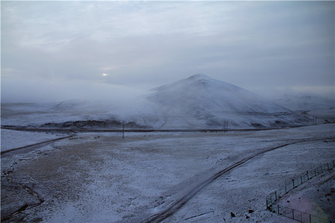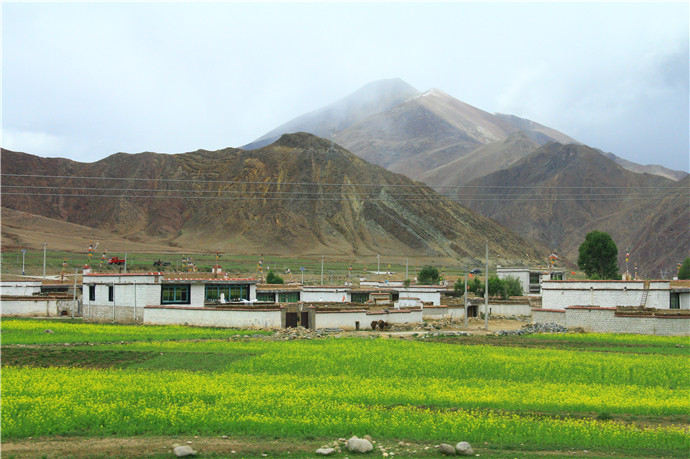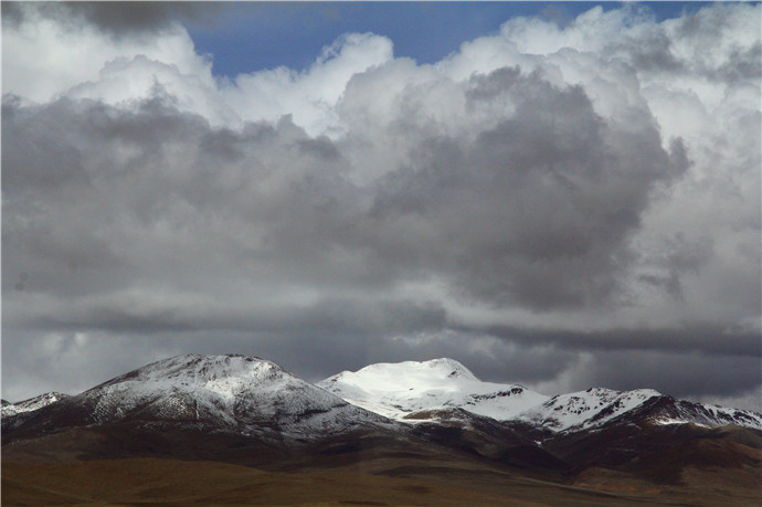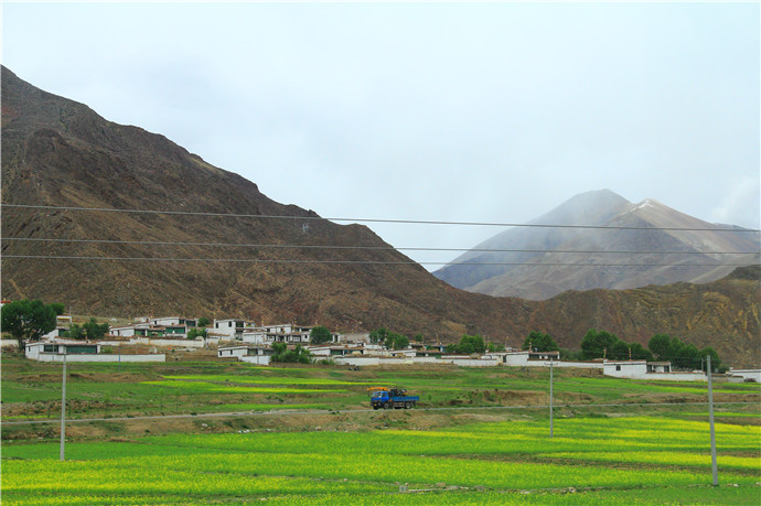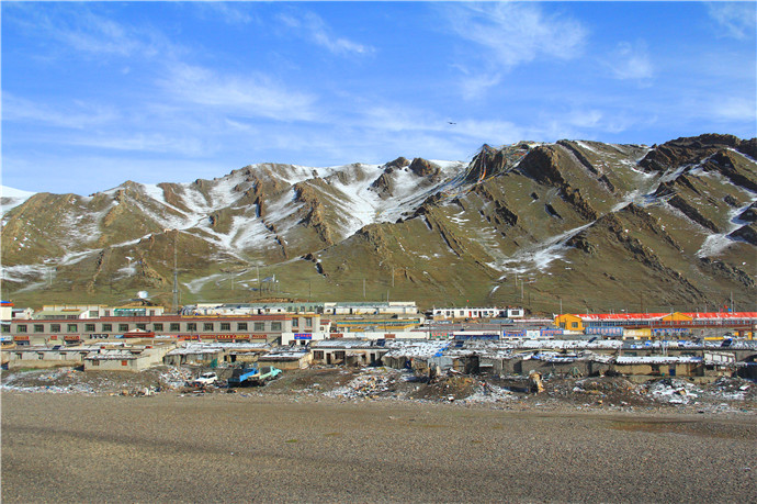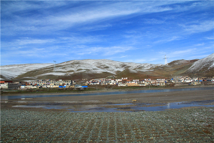 青藏高原的天气就是这样,这边晴空万里,那边冰天雪地,再往前终于看到了村庄