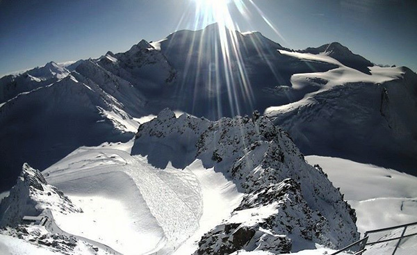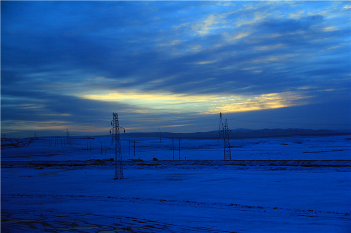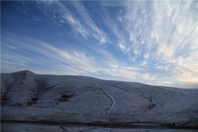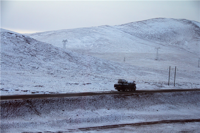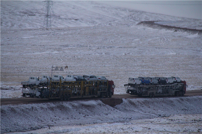 到达雪山,看到青藏公路上的火车在雪地里前行