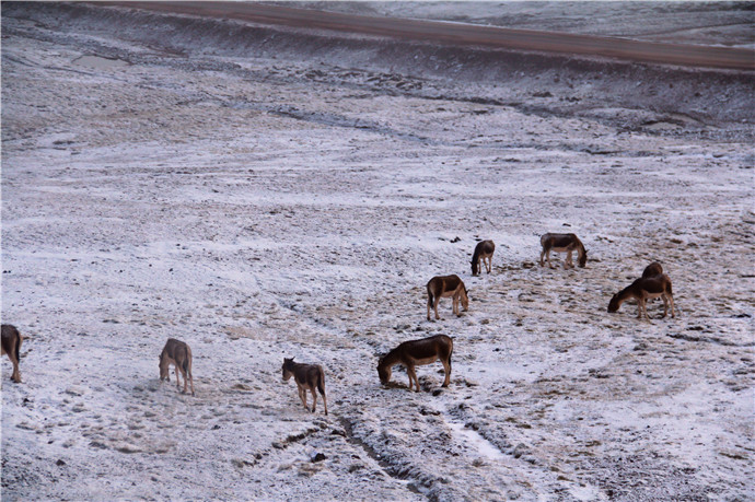 发现雪地里野驴在吃食