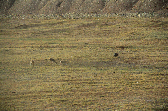 过了雪山到达可可西里无人区,看见几只藏羚羊在吃草