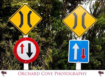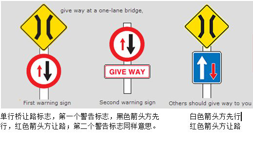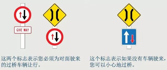 很多桥梁双向只有一条车道。请注意指示牌,顺红色箭头方向行驶的车辆必须停车让行。