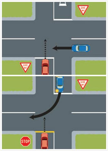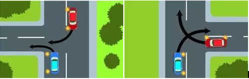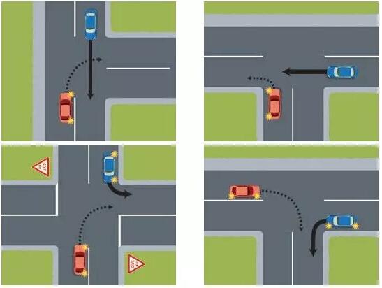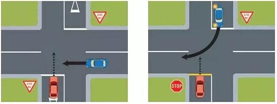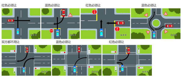 如下几张图可以很直接的反应新西兰的驾车规则。 下面几张图和国内的交通规则是一样的,红车拥有优先行驶权。司机需要记得在交叉路口 “转弯车让直行车”。