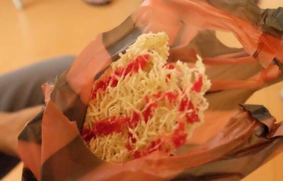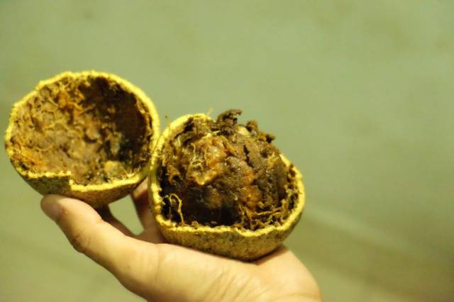 之前,早有耳闻来这里一定要试试南亚特有的木苹果( wood apple ),但网上没有告诉我们木苹果味道是多么地奇怪。先不说味道,光是要打开木苹果就得费上一点功夫。拿了一把西瓜刀,在木苹果上各个角度劈了几下,壳才微微裂开。里面的颜色如泥巴一般,用汤匙搅拌时,发现内馅比果酱还要浓稠。我们怀着既期待又忐忑的心情吃了一小口,马上皱着眉头,这不是酸梅的味道吗?怎么会是「苹果」呢?木苹果果然不符合我的胃口。