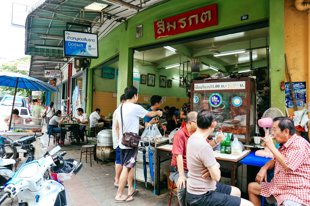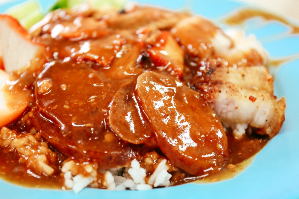 Si Morakot家保持了泰式叉烧饭的传统做法,使用木炭烤制所有的肉类。浓稠的酱汁覆盖在叉烧肉和香肠上,另外还配了一个溏心蛋。酱汁的颜色很深,味道浓郁,口感有些偏甜。叉烧肉看起来有点肥,但是口感十分酥脆,可以给一万个赞了!另外,他们家的分量要比很多路边摊多很多!