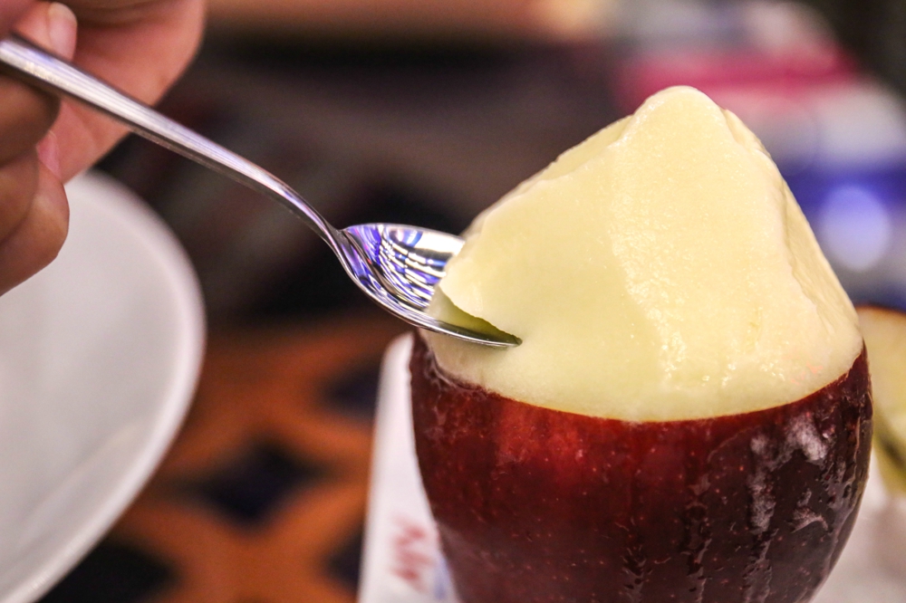 光吃刨冰就很过瘾,但是居然还配了新鲜榴莲做成的果酱。可以淋在刨冰上面,简直就是double榴莲味!更绝妙的是,刨冰的里层还大有乾坤,全部都是香甜的糯米。