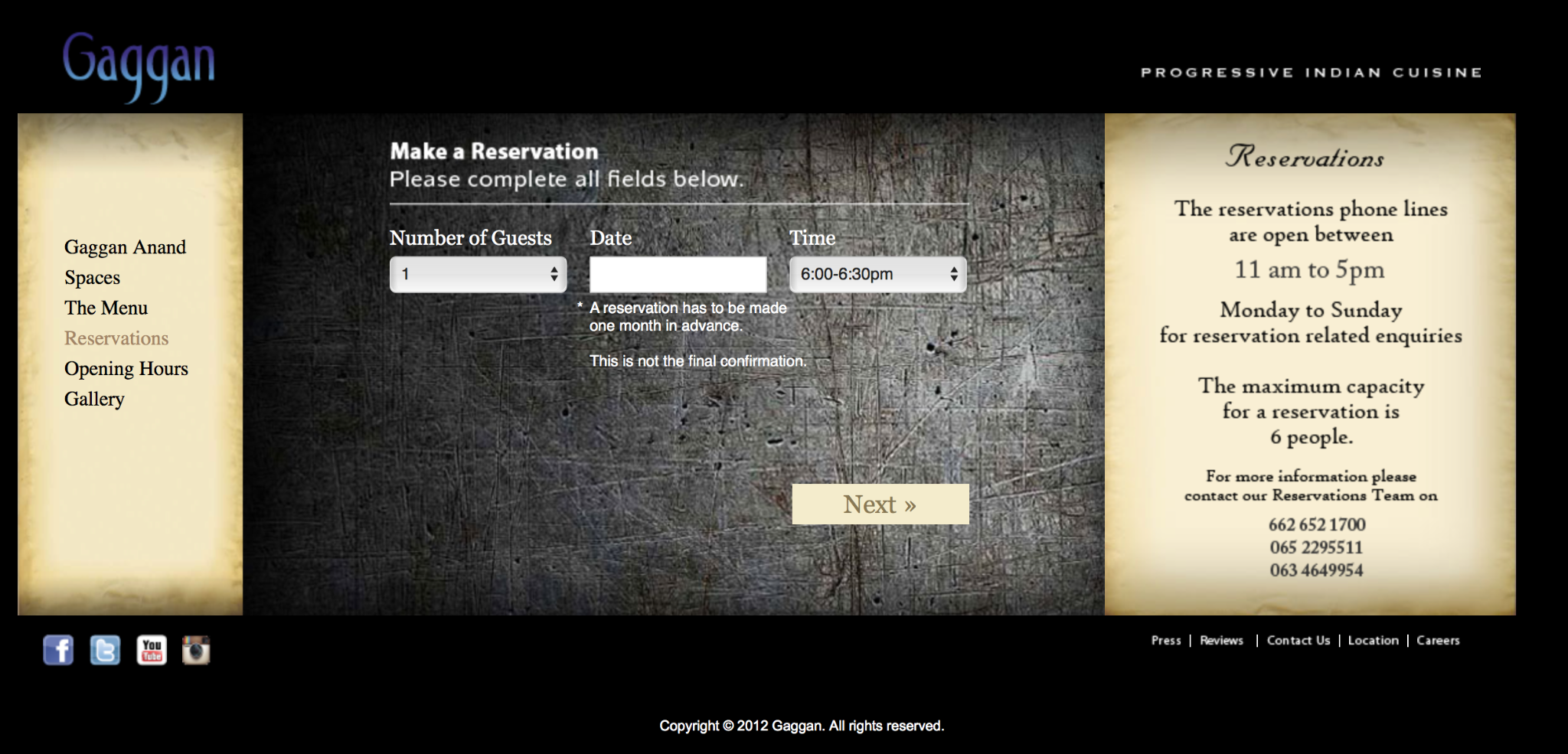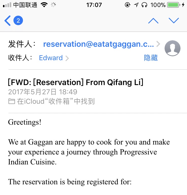 为什么说看运气呢,因为不是你填了信息,他就会通知你。首先,你填好邮箱后,邮箱里会有一封自动回复的邮件,意思是说,这封邮件是自动回复的,并不代表已经预定成功了,只有收到餐厅的确认邮件,才代表真正预订成功了。那么这时,你能做的,就是等。但是,我等了快一周,都不见他给我回邮件,然后给他打电话,为此还特地充了skype余额。Gaggan的电话在google上可以查得到,打之前加一下泰国的country code+66就可以了,不过他家电话是真心不好打,打一打就知道了。不夸张地说,打15个,能有一个能接通的就算不错的了。后来去吃饭的时候问了下,是因为打电话的人太多了,几乎一直都在占线,比Apple的客服电话还不好打通,真心的。但是呢,打通了,其实也没有什么用,他会告诉你,用很官僚的语气和你说,先生,您慢慢等着就行了,会有工作人员回复您邮件的,其实都是bullshit,因为我之后干了一件事,发现他们回邮件完全是随机的。我之后又用另外两个名字,和另外两个email,预定了一下,然后过了差不多又一星期,发现只有一个邮箱收到了预定成功的回复。