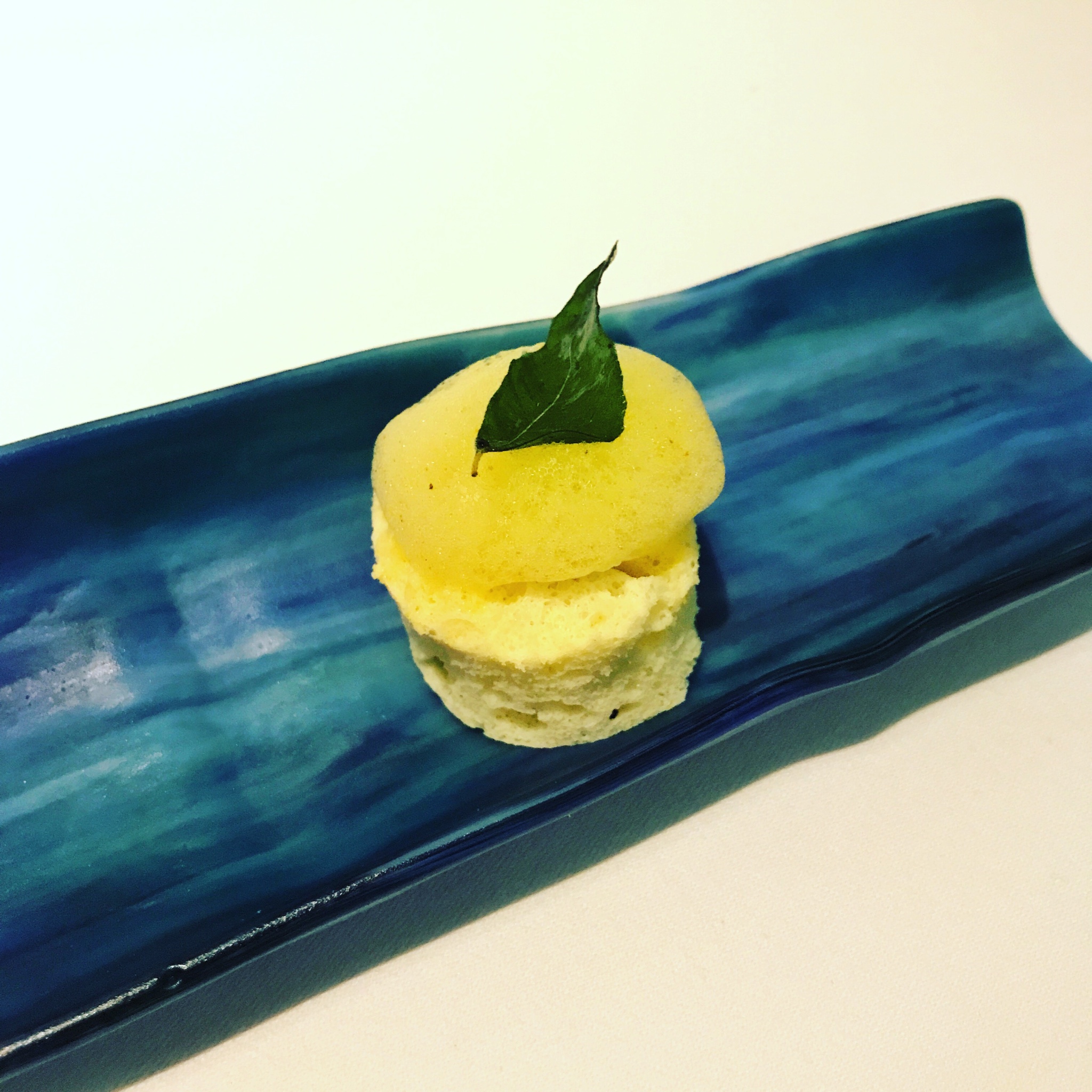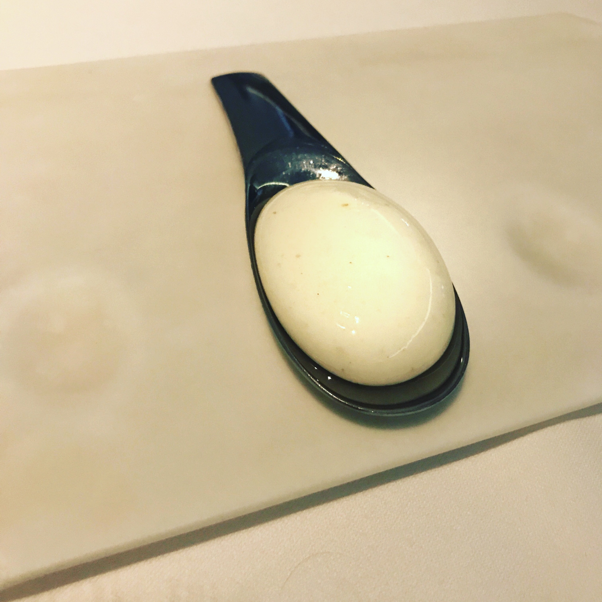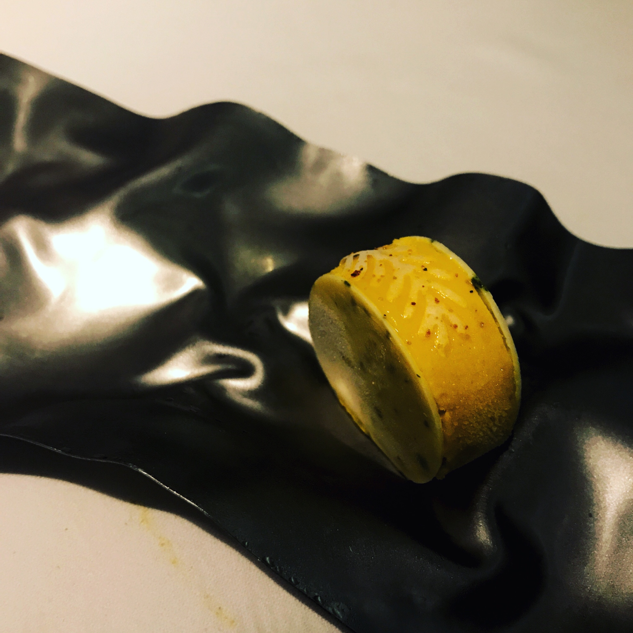 Gaggan Bangkok这道菜算是Gaggan最typical的一道菜了吧,因为Gaggan菜单改了好多次,但是这一道一直留着,叫yoghurt explosion,里面是酸奶,外面十一层膜,在嘴里膜破了之后,酸奶会像是爆炸一样的感觉,在嘴里弥漫开来,味道和体验都不错。