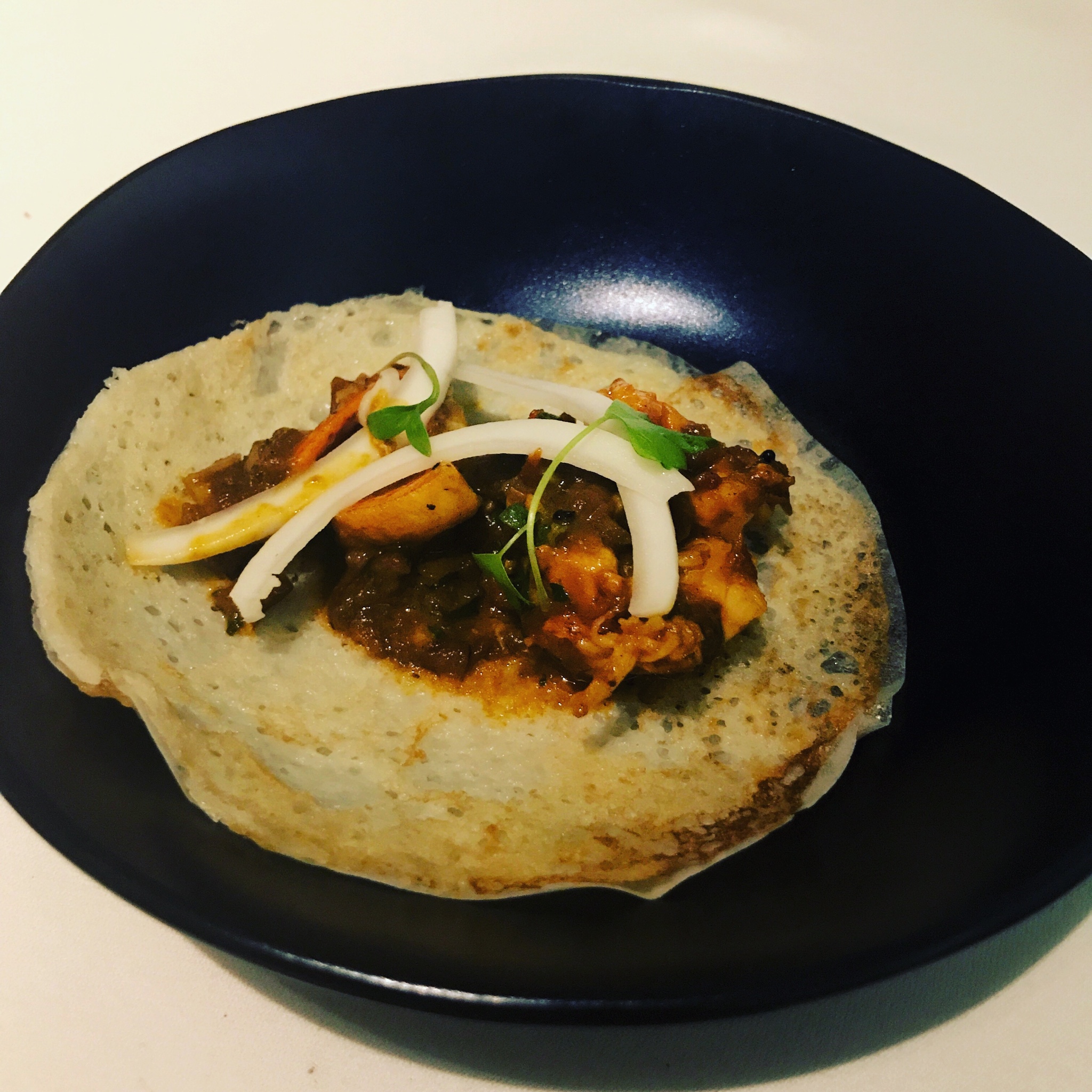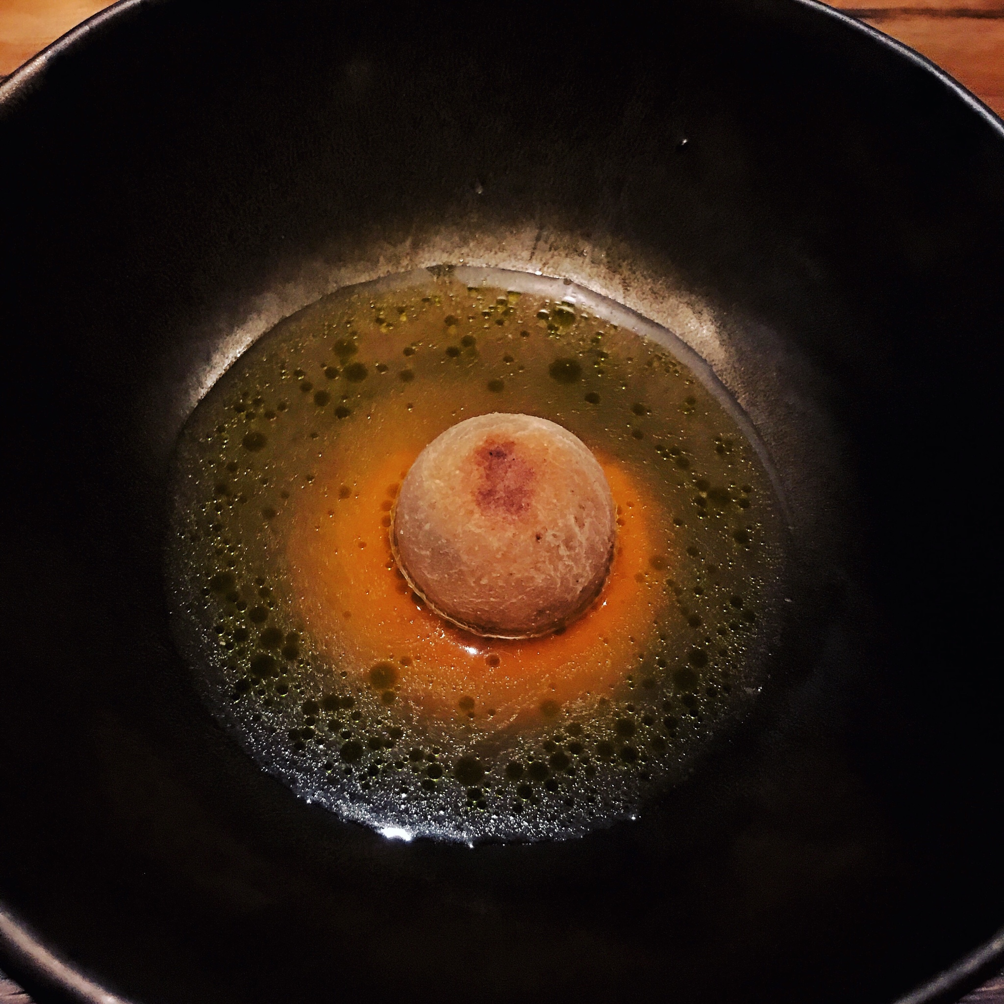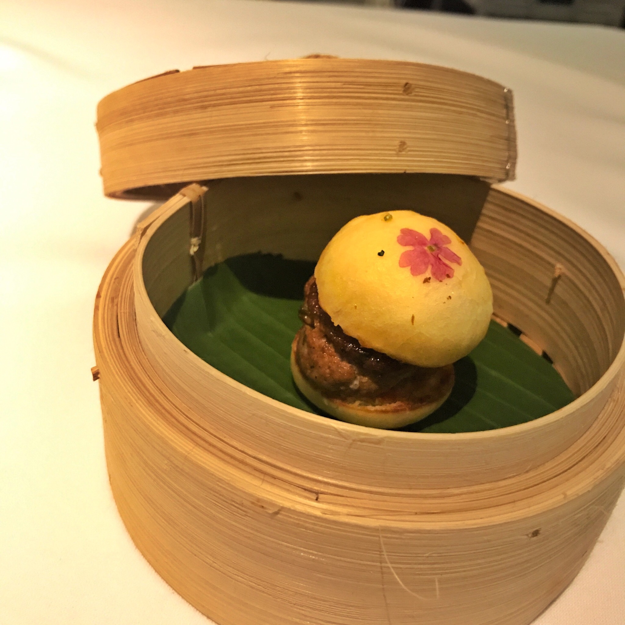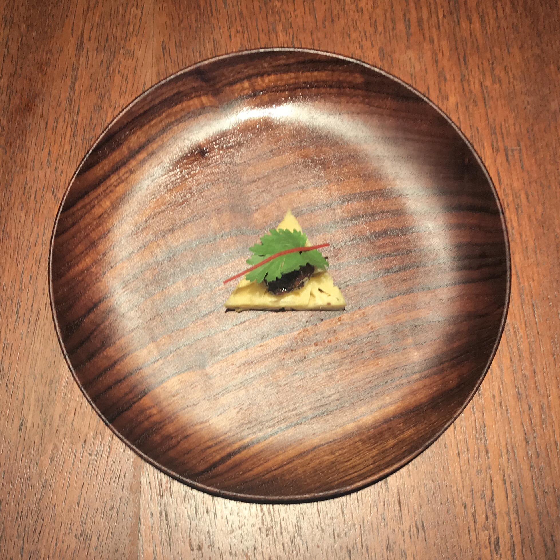 Gaggan Bangkok这道菜算是Gaggan最typical的一道菜了吧,因为Gaggan菜单改了好多次,但是这一道一直留着,叫yoghurt explosion,里面是酸奶,外面十一层膜,在嘴里膜破了之后,酸奶会像是爆炸一样的感觉,在嘴里弥漫开来,味道和体验都不错。