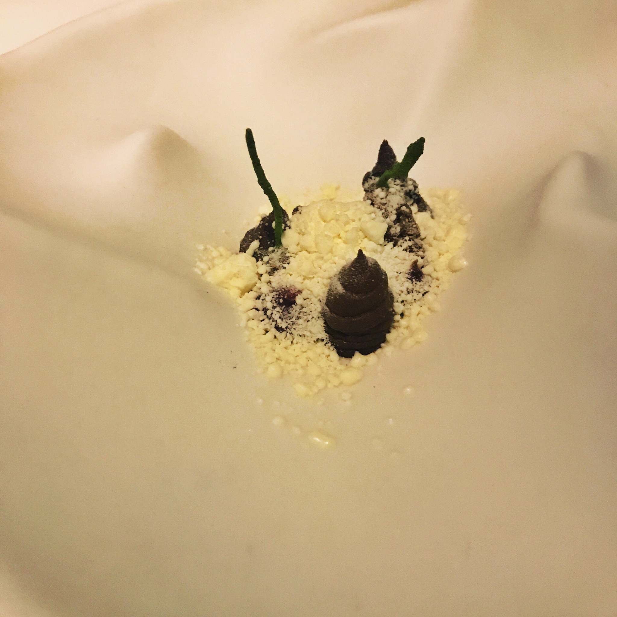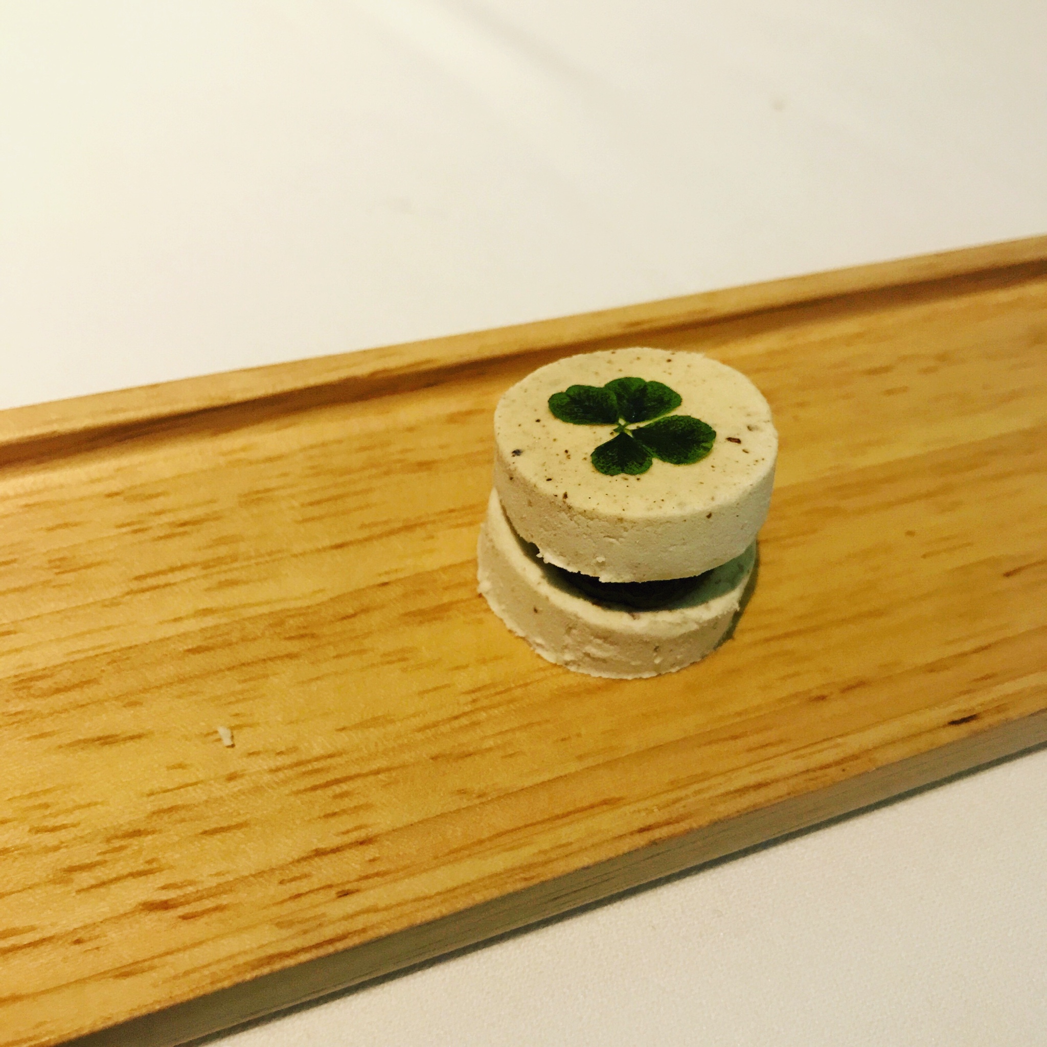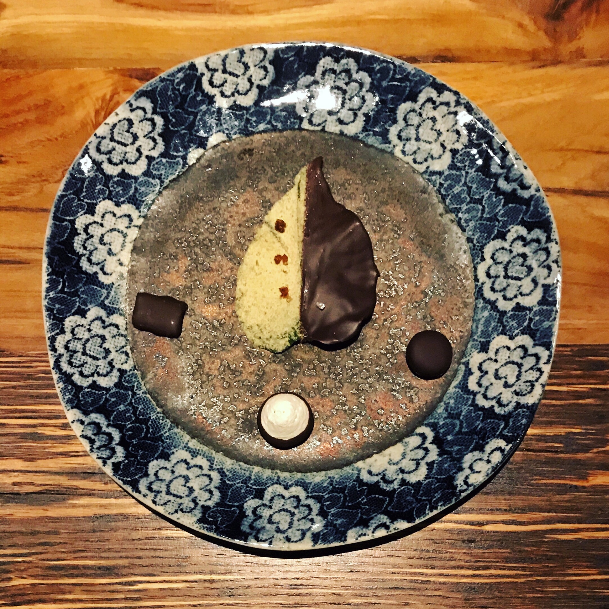 Gaa这是最后一道甜品,中间的叶子形状的东西,右边是巧克力,左边是口感非常像植物的一种东西,结合的非常好,没有任何违和感。