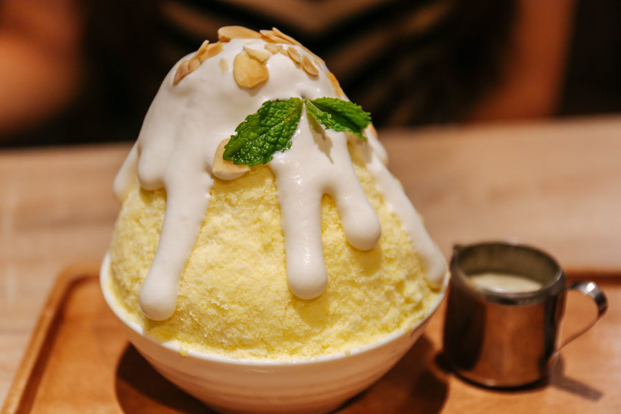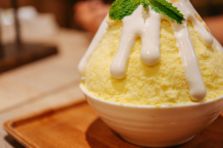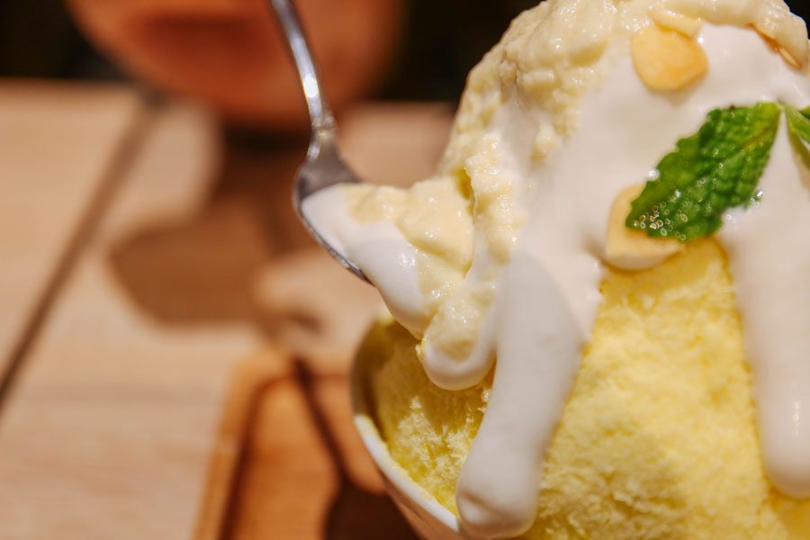 金黄色榴莲刨冰和白色奶油的交织,鲜奶油从刨冰的顶部流下,凝固在刨冰的腰间,跟一座雪山一样。刨冰十分细腻,几乎成了粉状,本身就是榴莲味,不再需要其他调味。