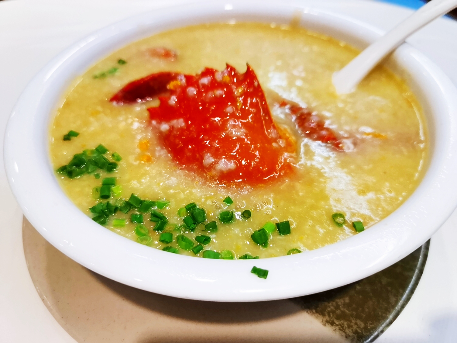 蟹油的鲜香混着米香,闻着就已经香气扑鼻。螃蟹肉的味道已经融入每一口的粥里,辅以姜丝的厚重和葱花的清香,那鲜甜的味道,连碗都想舔干净