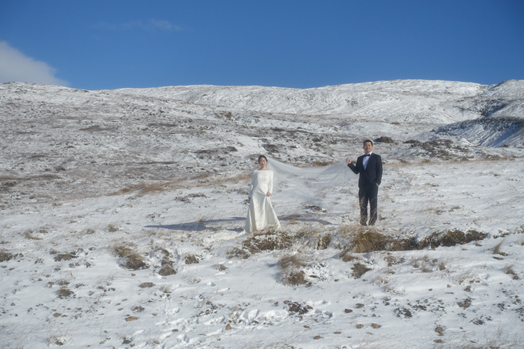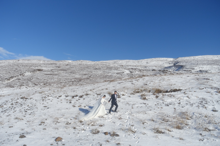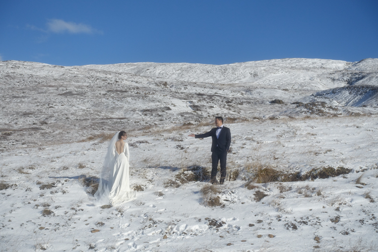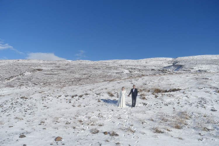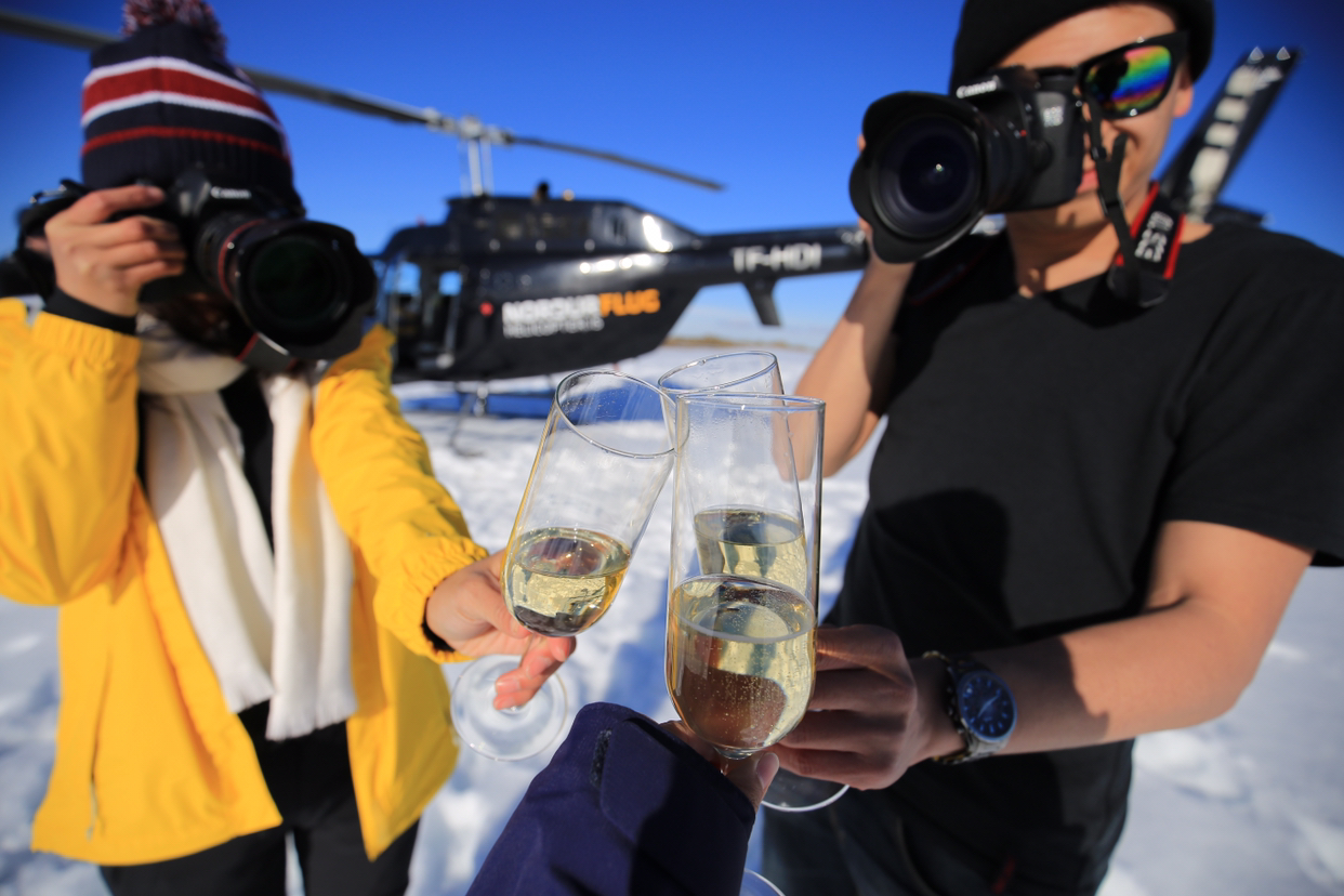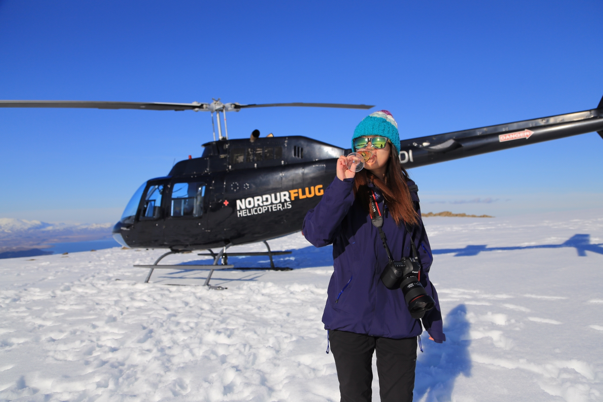 中途機師竟然從直升機裡拿出香檳來,雪山上喝香檳初體驗~