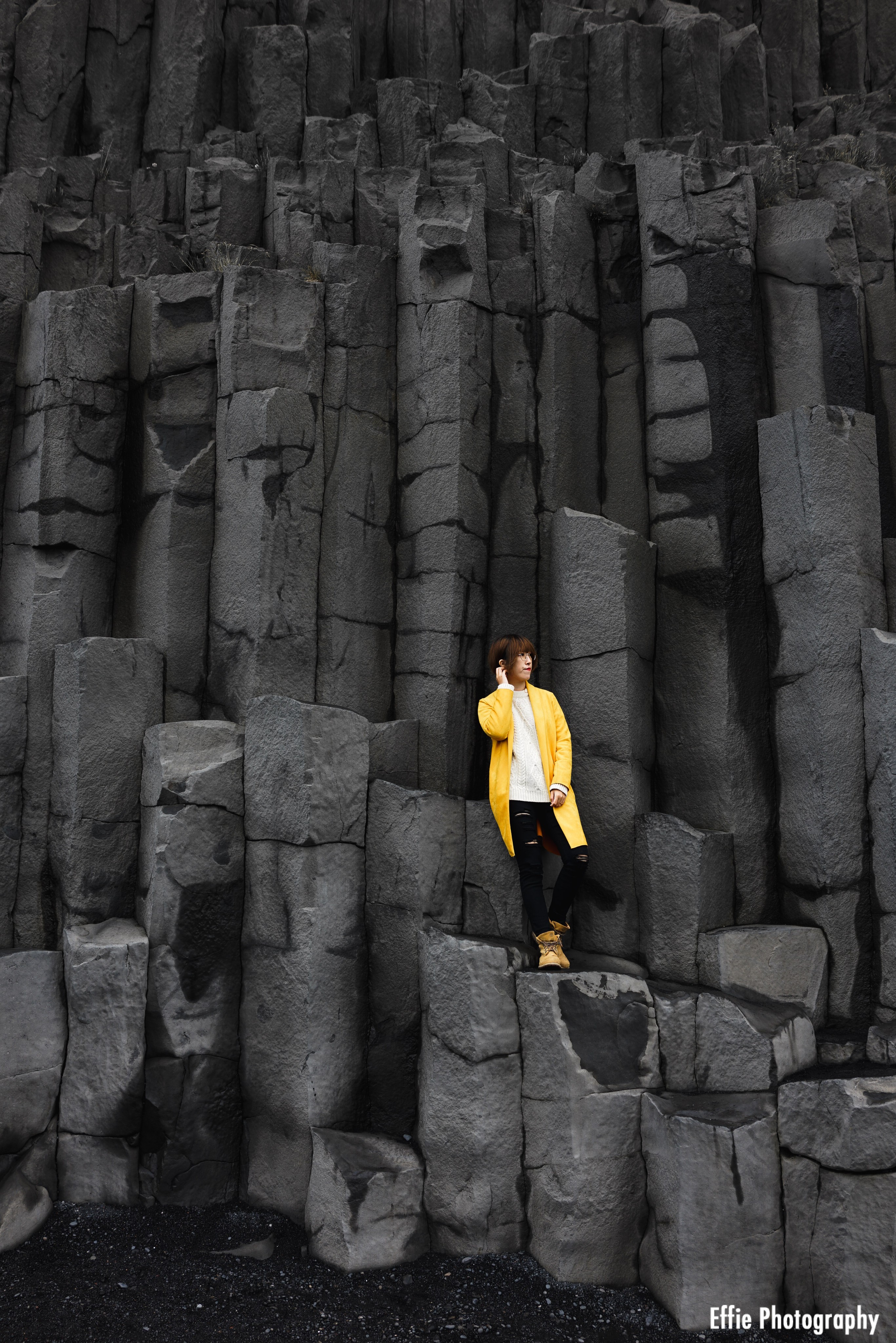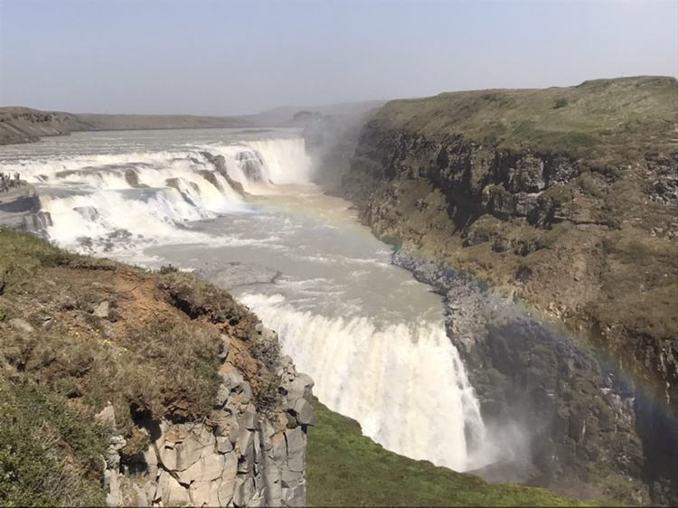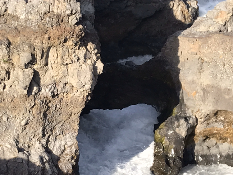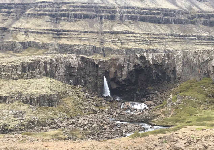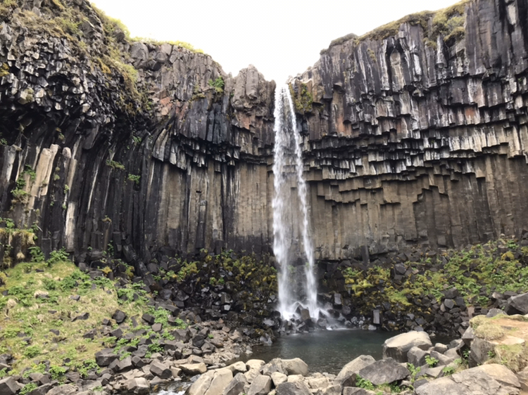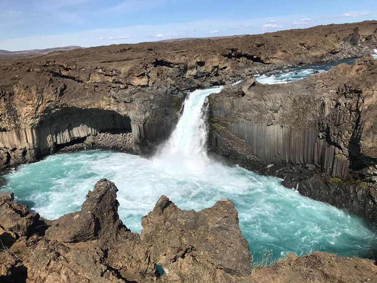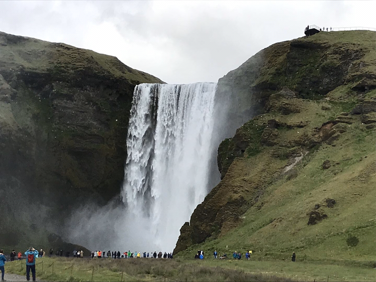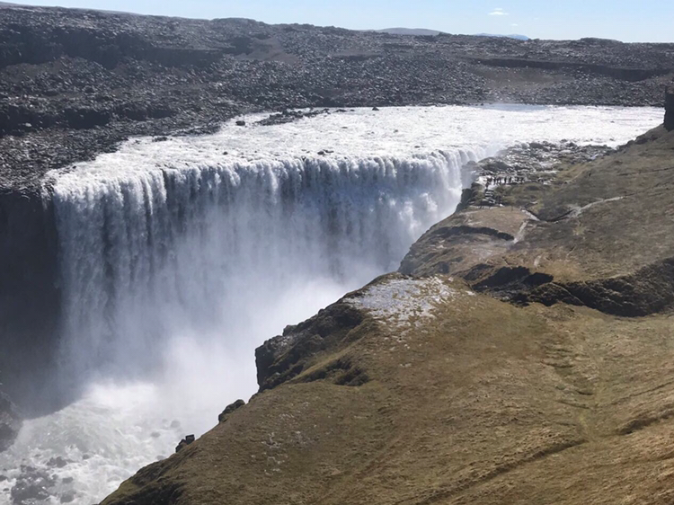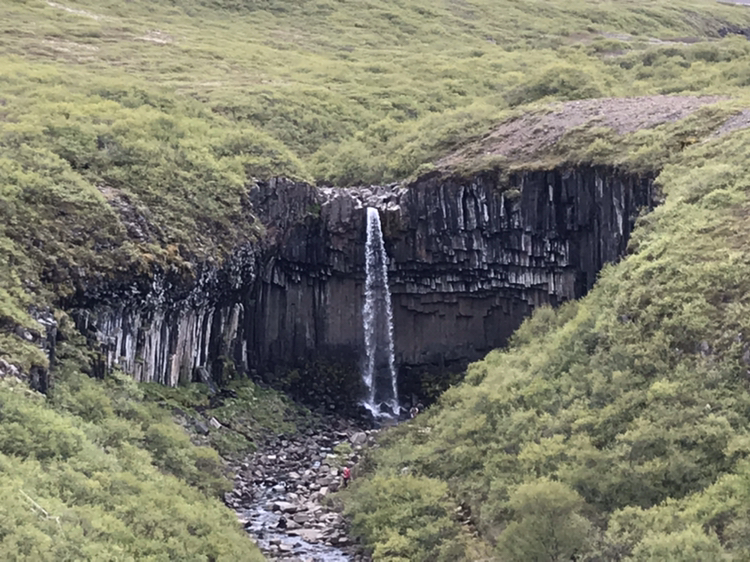 轻松的行程变成疲劳的爬坡,好不容易来到瀑布前端。瀑布呈银丝般飘落,远观恰似天外飞仙,可是此仙并非重点,背景那一大片棱角分明的黑色柱状玄武岩才是亮点,形状像教堂的管风琴,静下心来倾听,感受瀑布飞溅的不同乐章。