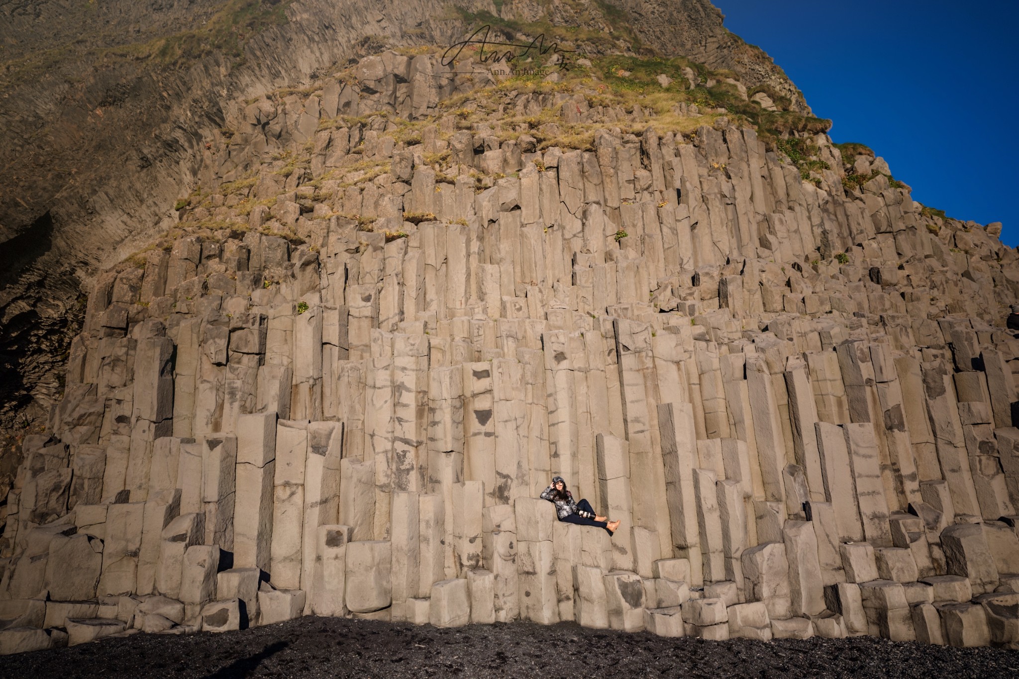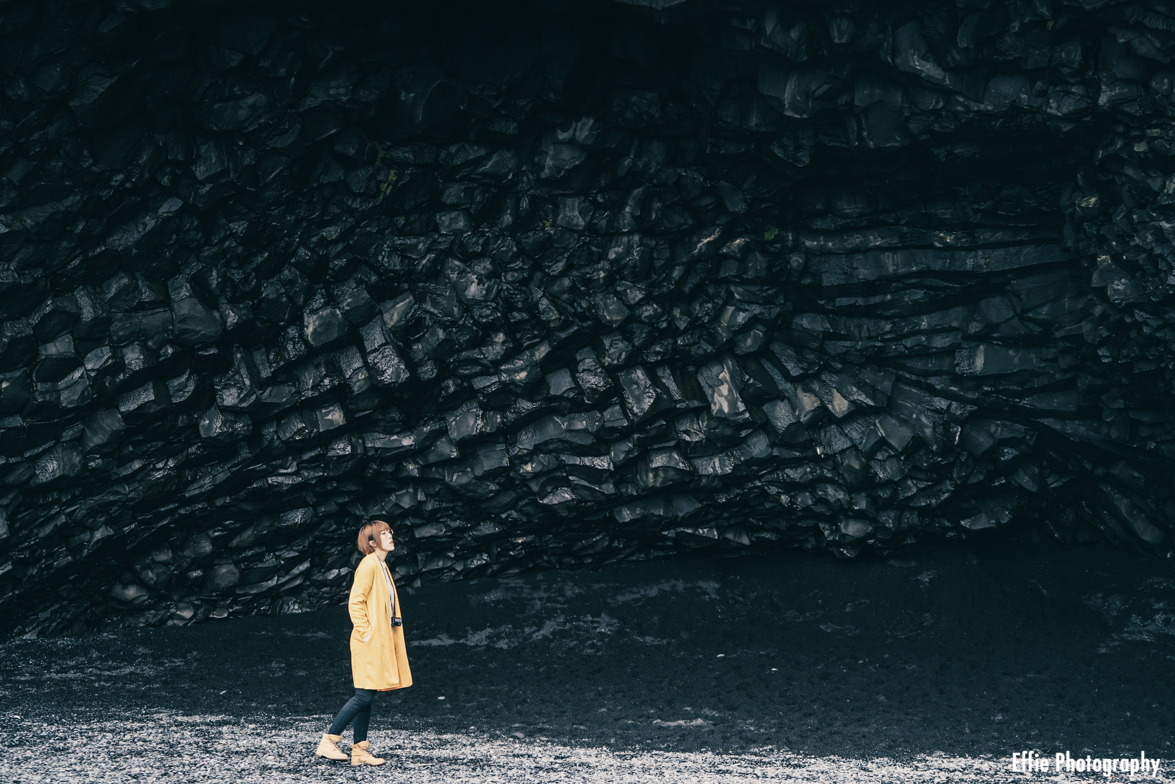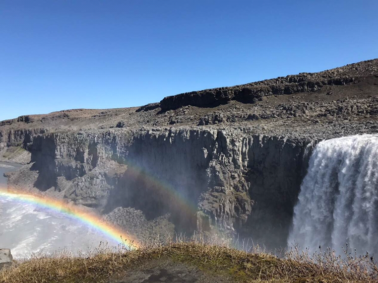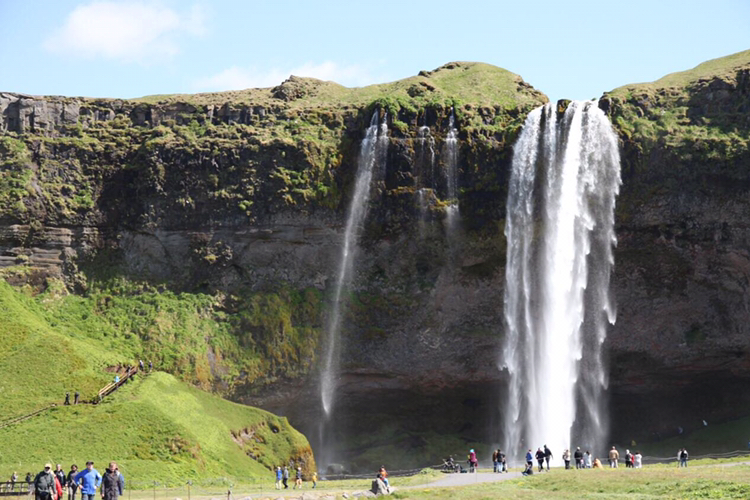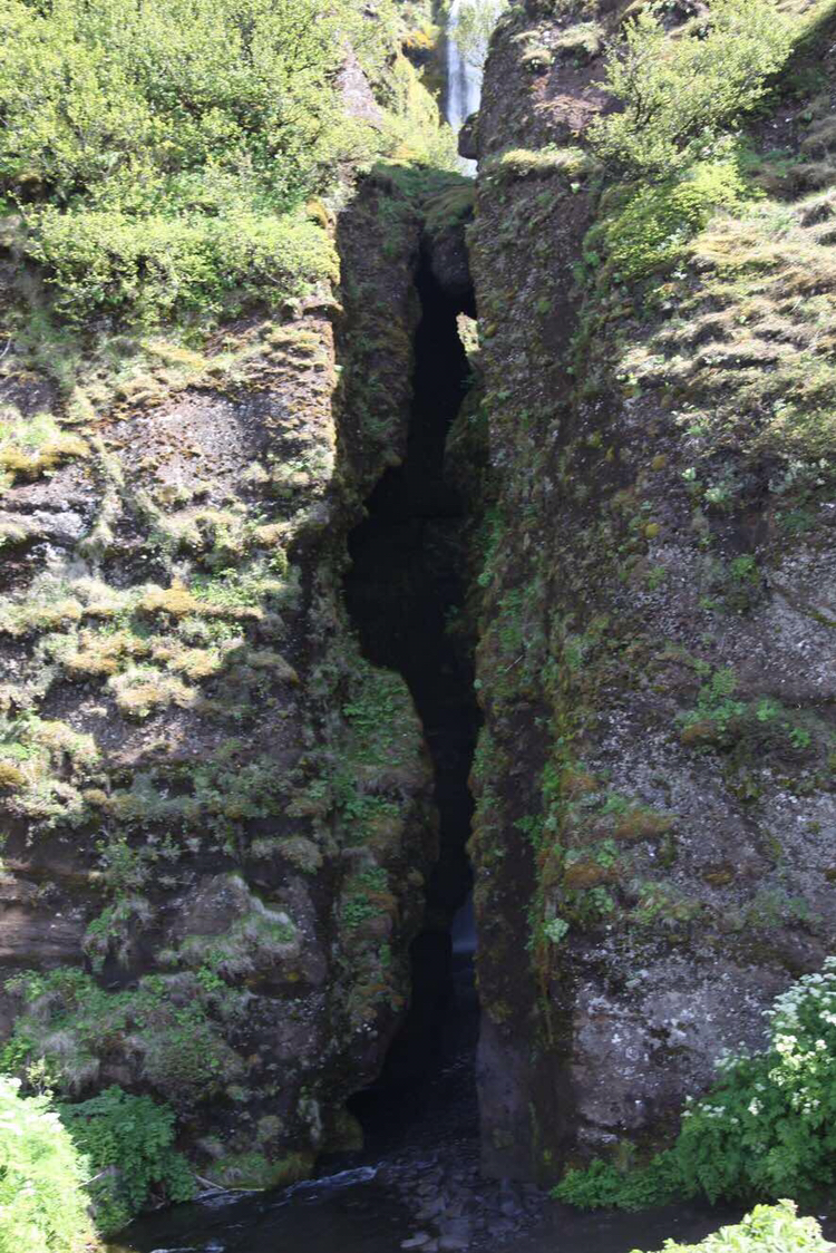 轻松的行程变成疲劳的爬坡,好不容易来到瀑布前端。瀑布呈银丝般飘落,远观恰似天外飞仙,可是此仙并非重点,背景那一大片棱角分明的黑色柱状玄武岩才是亮点,形状像教堂的管风琴,静下心来倾听,感受瀑布飞溅的不同乐章。