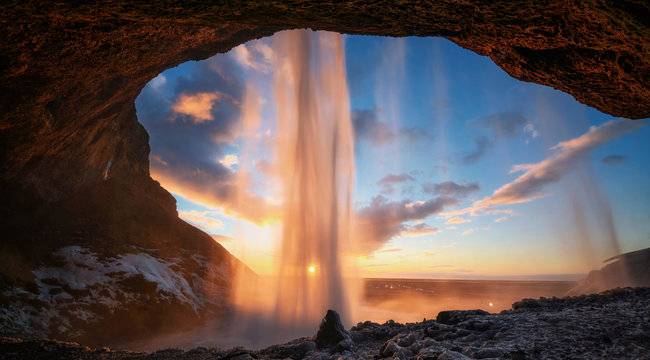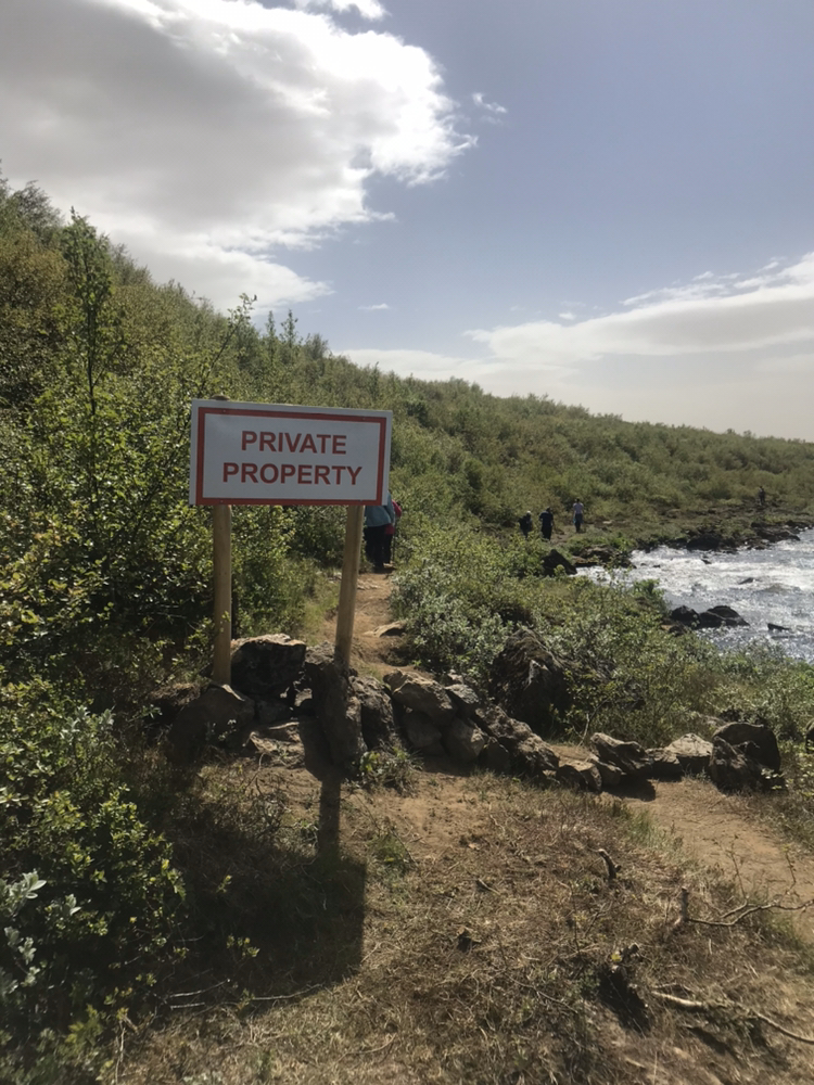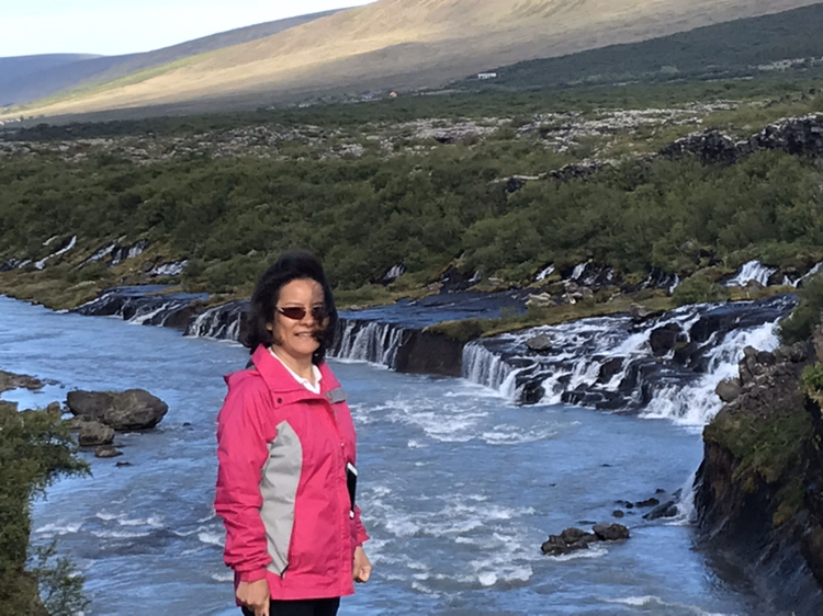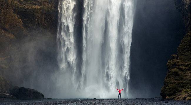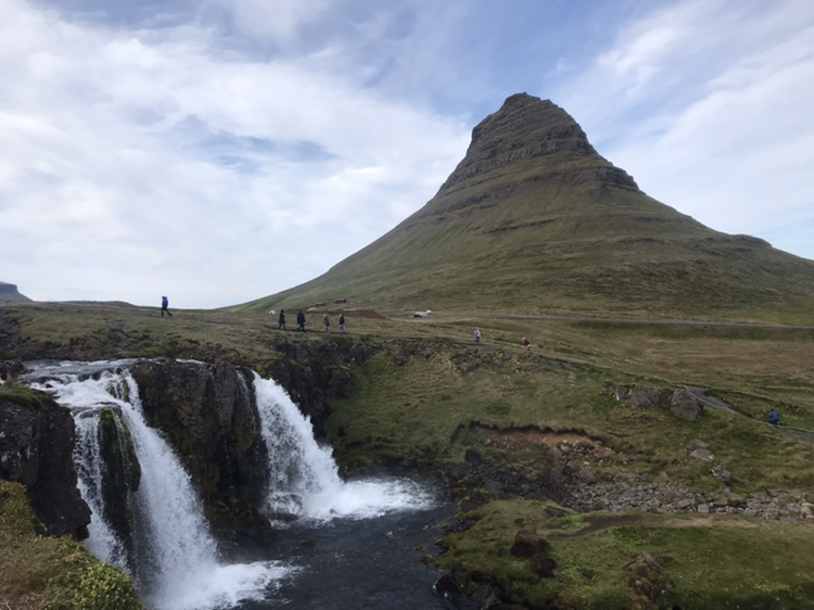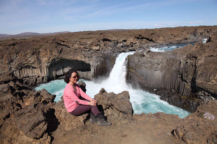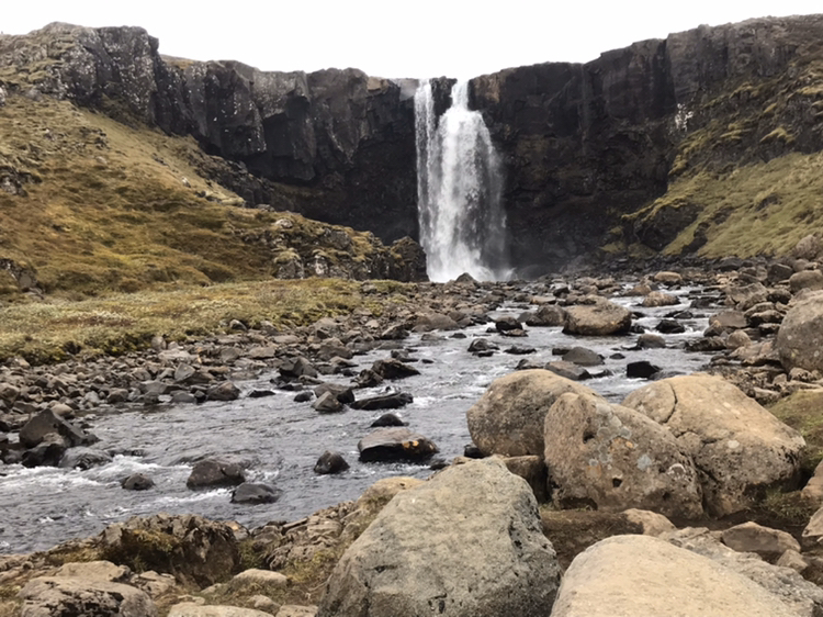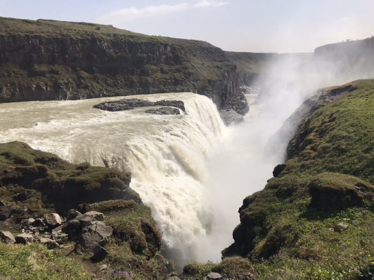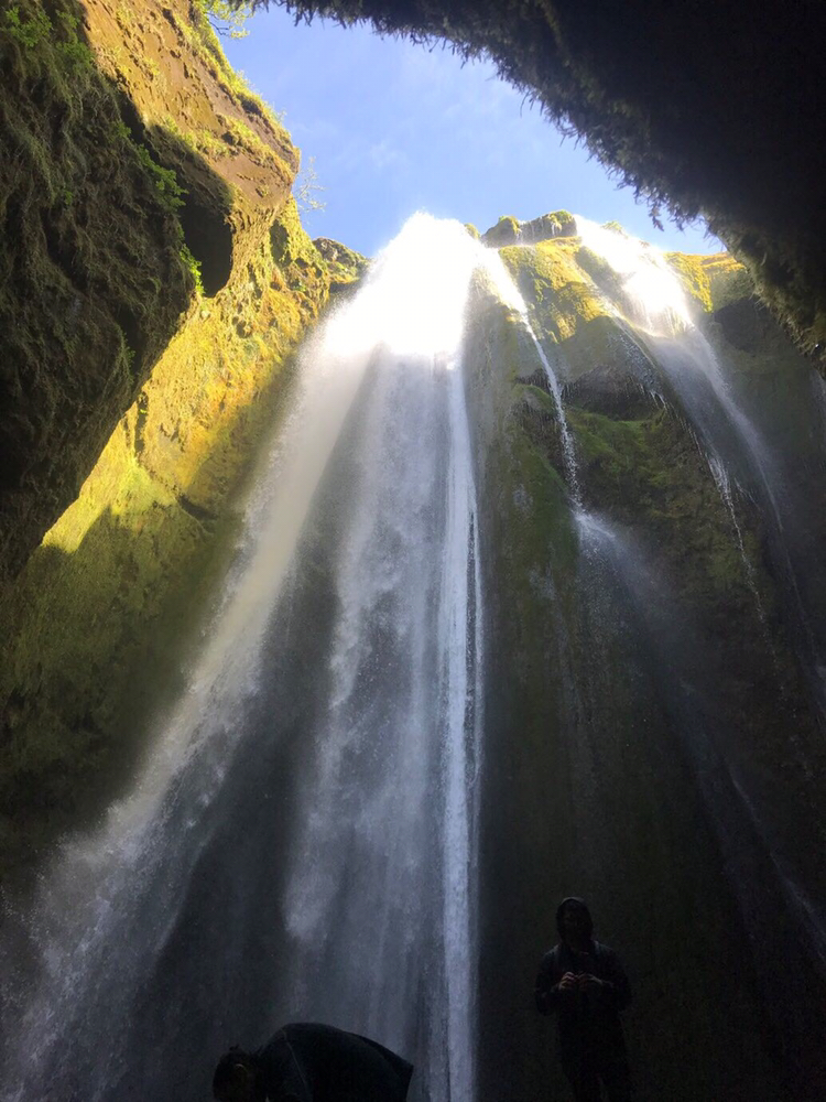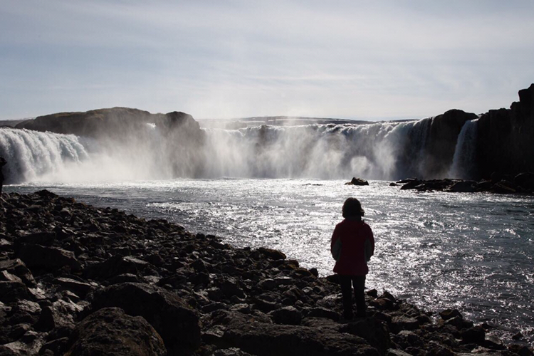 轻松的行程变成疲劳的爬坡,好不容易来到瀑布前端。瀑布呈银丝般飘落,远观恰似天外飞仙,可是此仙并非重点,背景那一大片棱角分明的黑色柱状玄武岩才是亮点,形状像教堂的管风琴,静下心来倾听,感受瀑布飞溅的不同乐章。