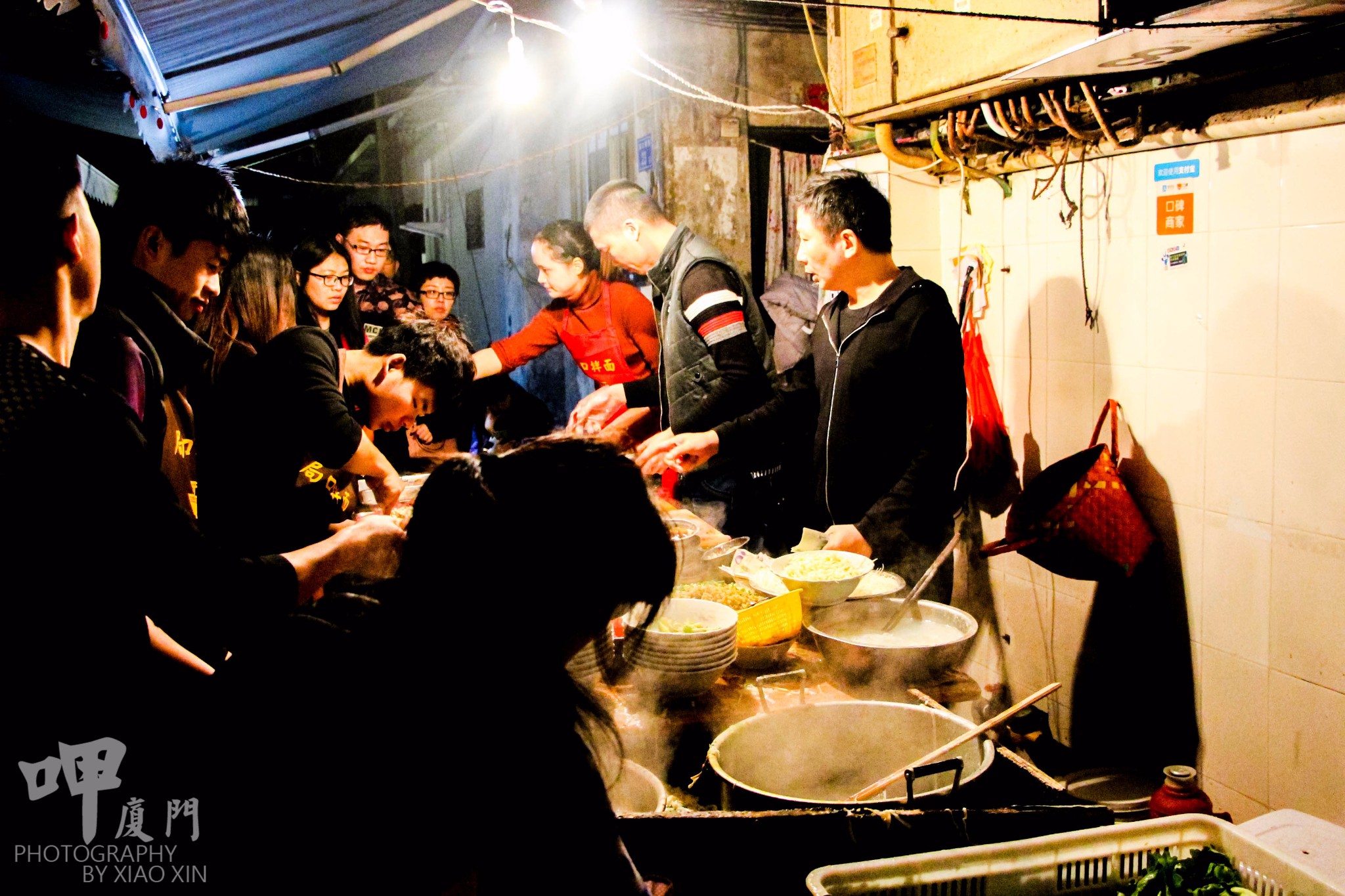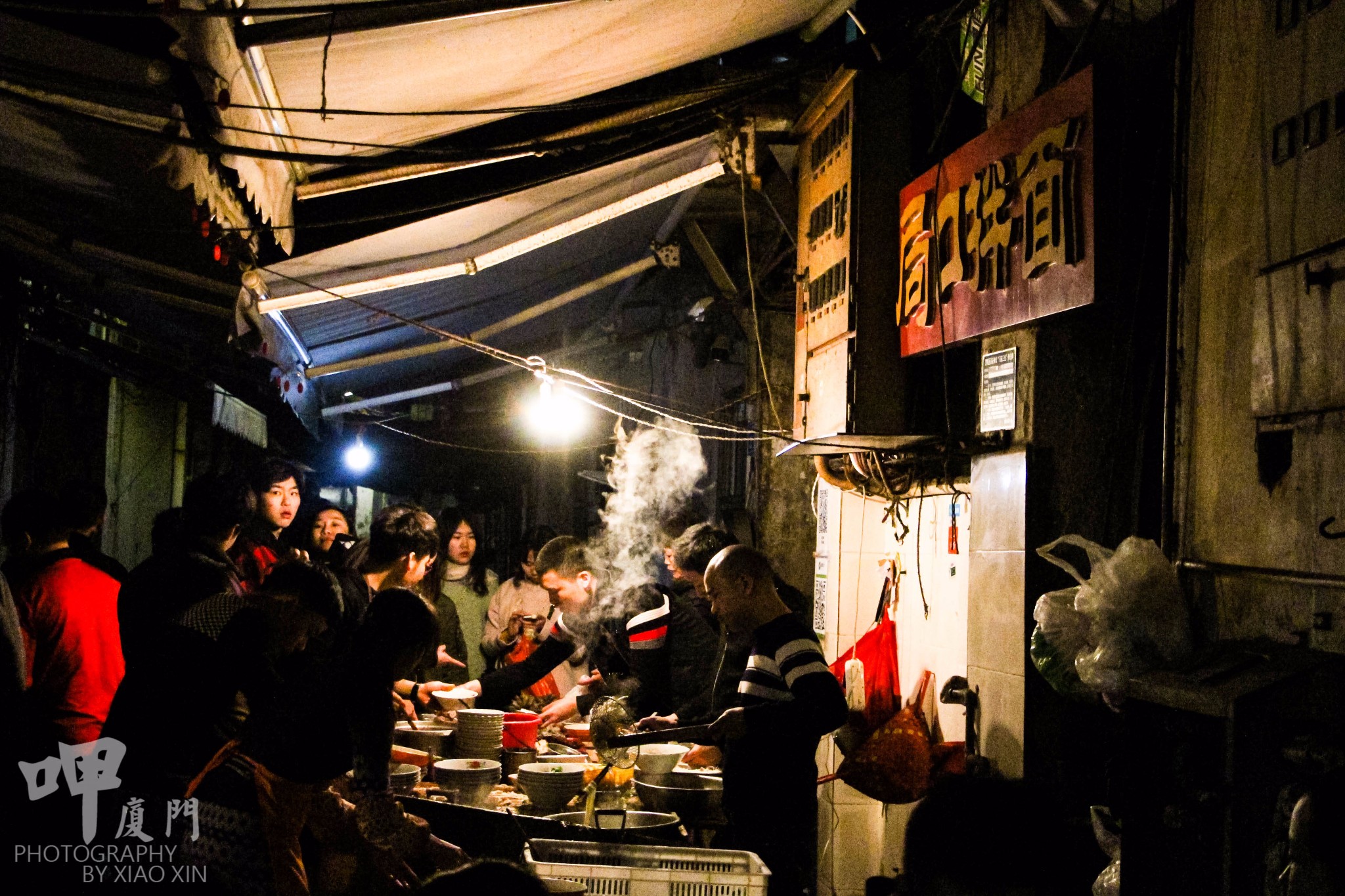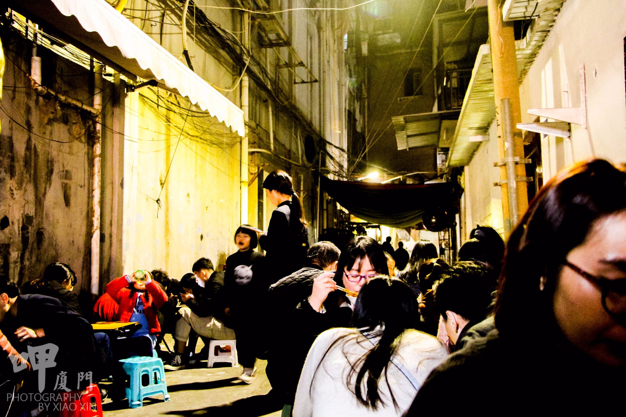 大家都挤在矮矮小小的桌边,占了一条巷子,颇壮观。