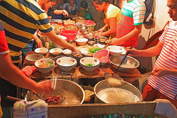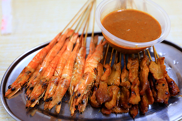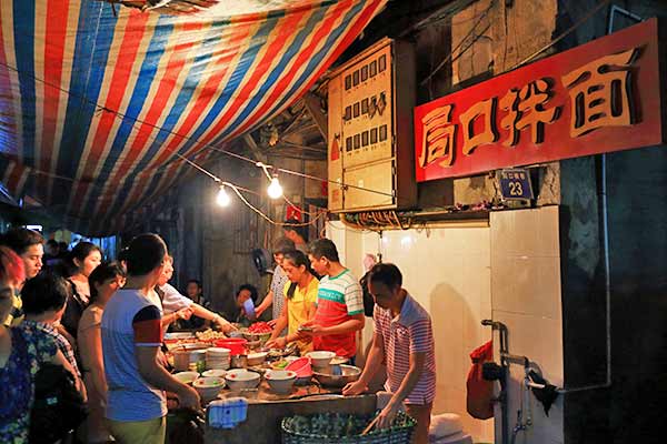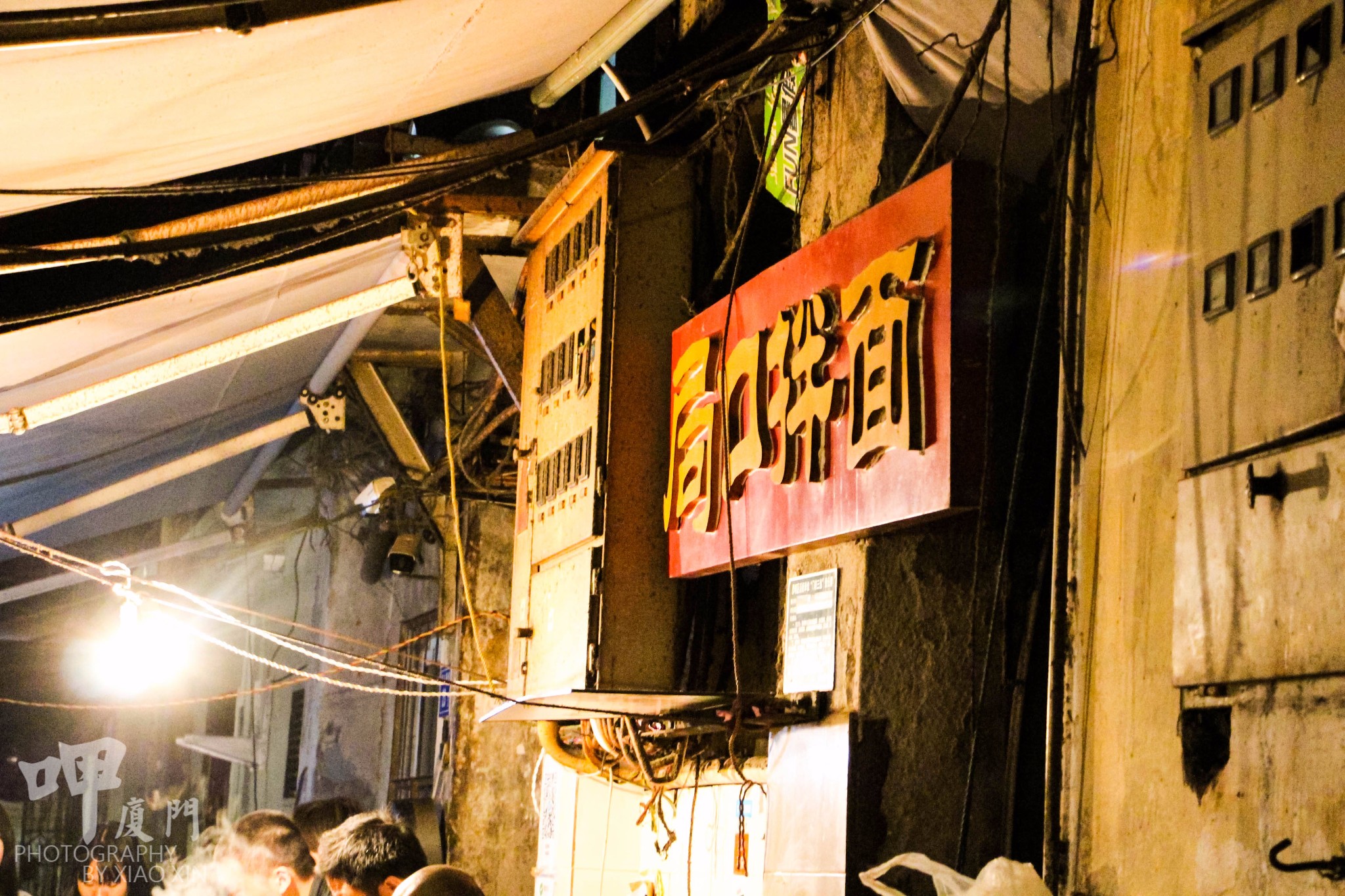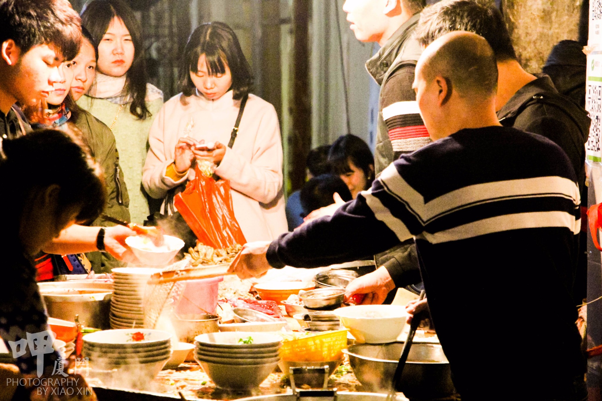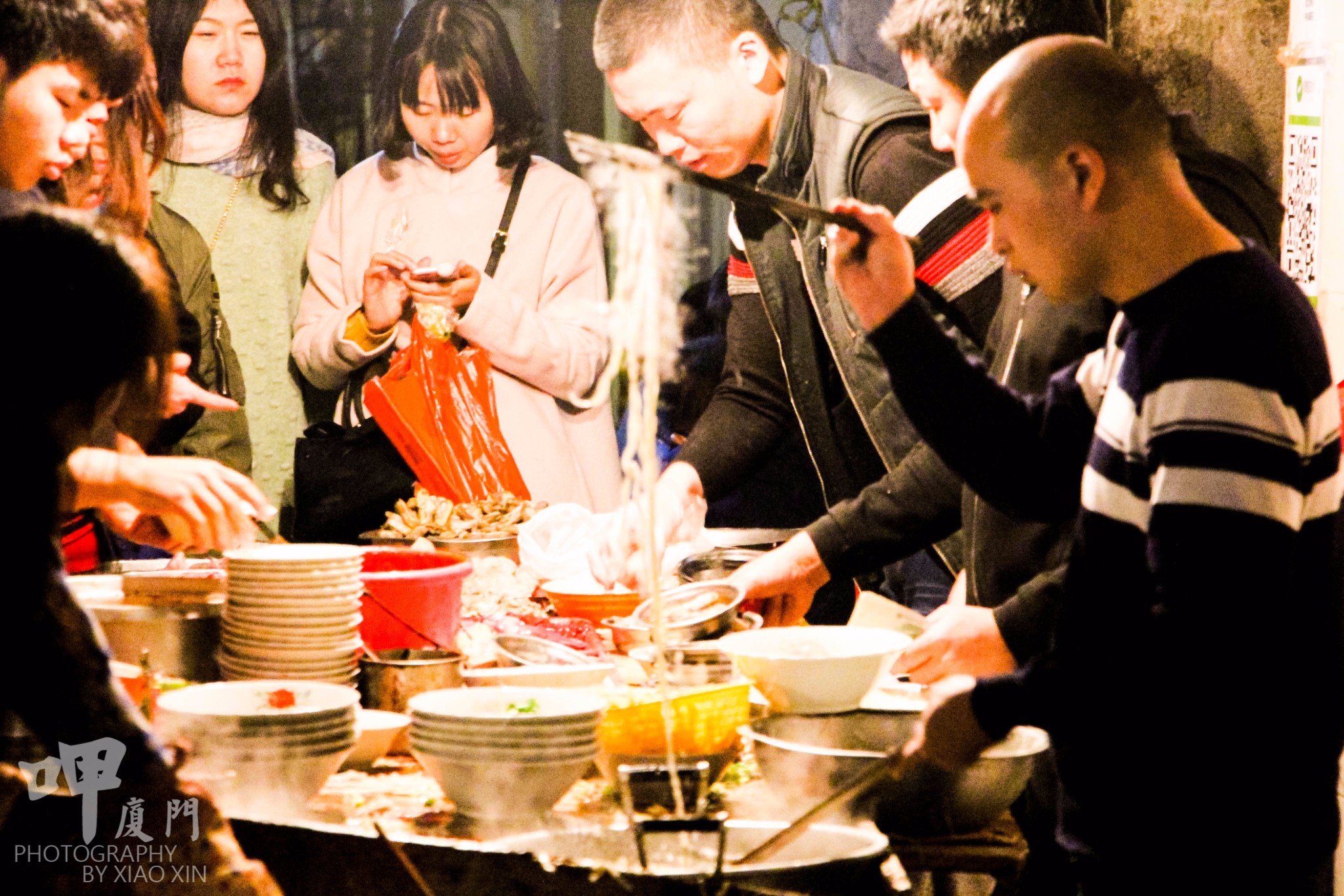 大家都挤在矮矮小小的桌边,占了一条巷子,颇壮观。