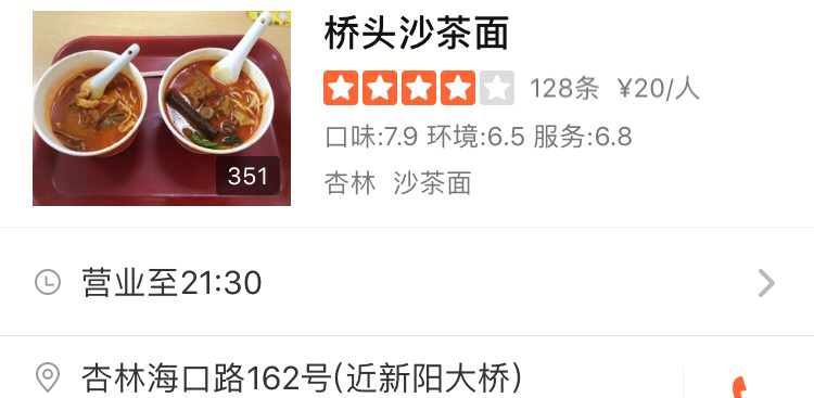这是早期吃过的比较好吃的沙茶面,当然吃过桥头和友声它就退居其后啦!汤底的特点是偏甜!!店藏的很深,路痴的伙伴应该找不到,离我最近的一家!到这家之前有一家大社榕树下沙茶面,这家不是真的!!一定要认准“集美大社沙茶面”!