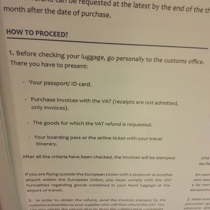 重要的事情说三遍:退税金额是一次性购物满90.15 欧元!退税(I.V.A 税(增值税) 13.8%)实际上因为各退税公司的手续费率是累进的,所以实际到手的退税率各不相同。西班牙退税的条件:1. 如果你不住在欧体境内(拿欧盟国家学生签证的人无法退税)2. 在同一家有 Tax Free 號誌的商...显示全部