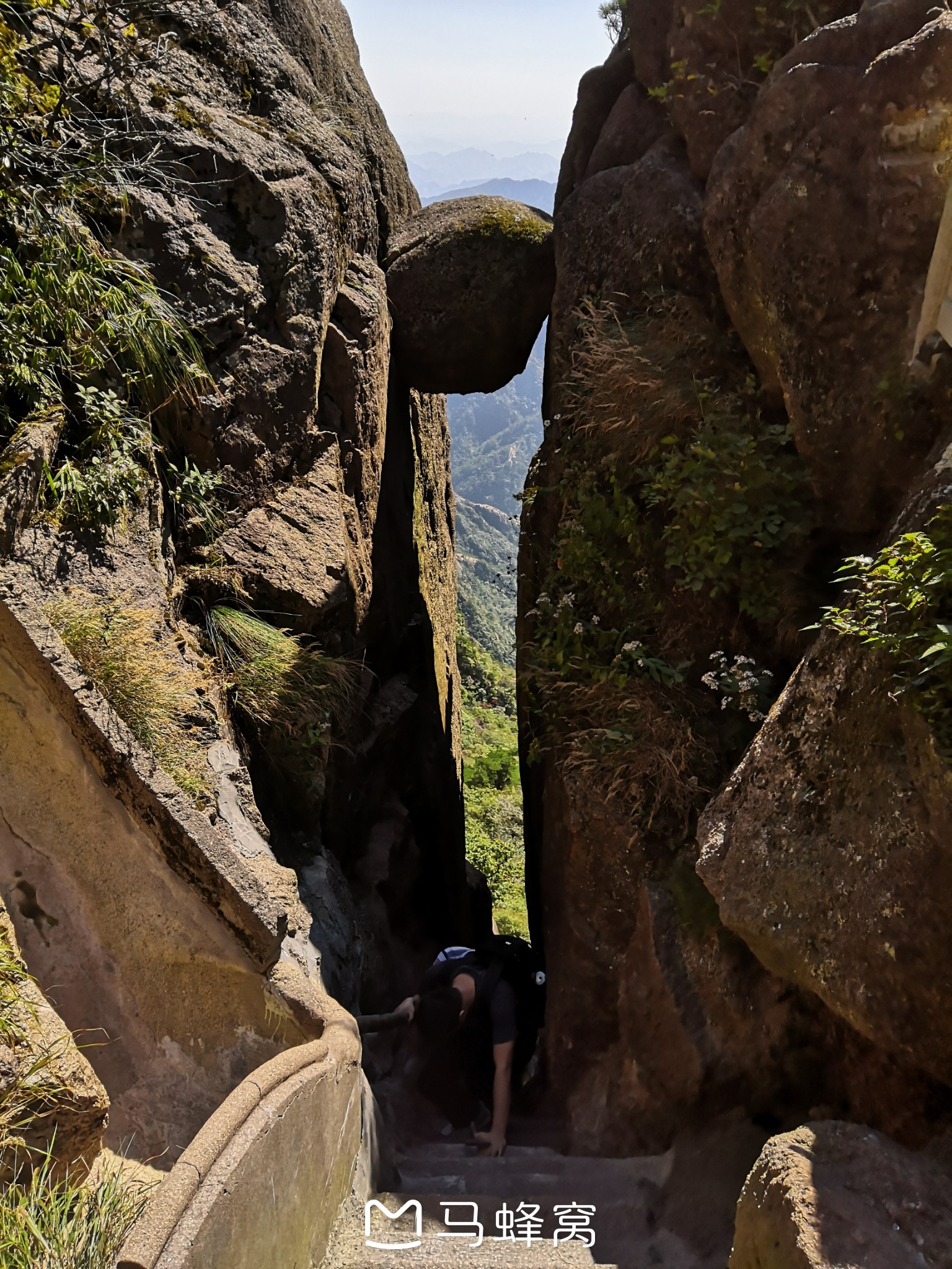 风景区登鳌鱼峰有两条路线,右边通过这条陡峭的一线天可直接登顶,路程短,速度快;左边往前经鳌鱼洞可近观鳌鱼石,路程较长。 为了节省体力,俺选了捷径,确实陡,但不难爬,几分钟就上去了。