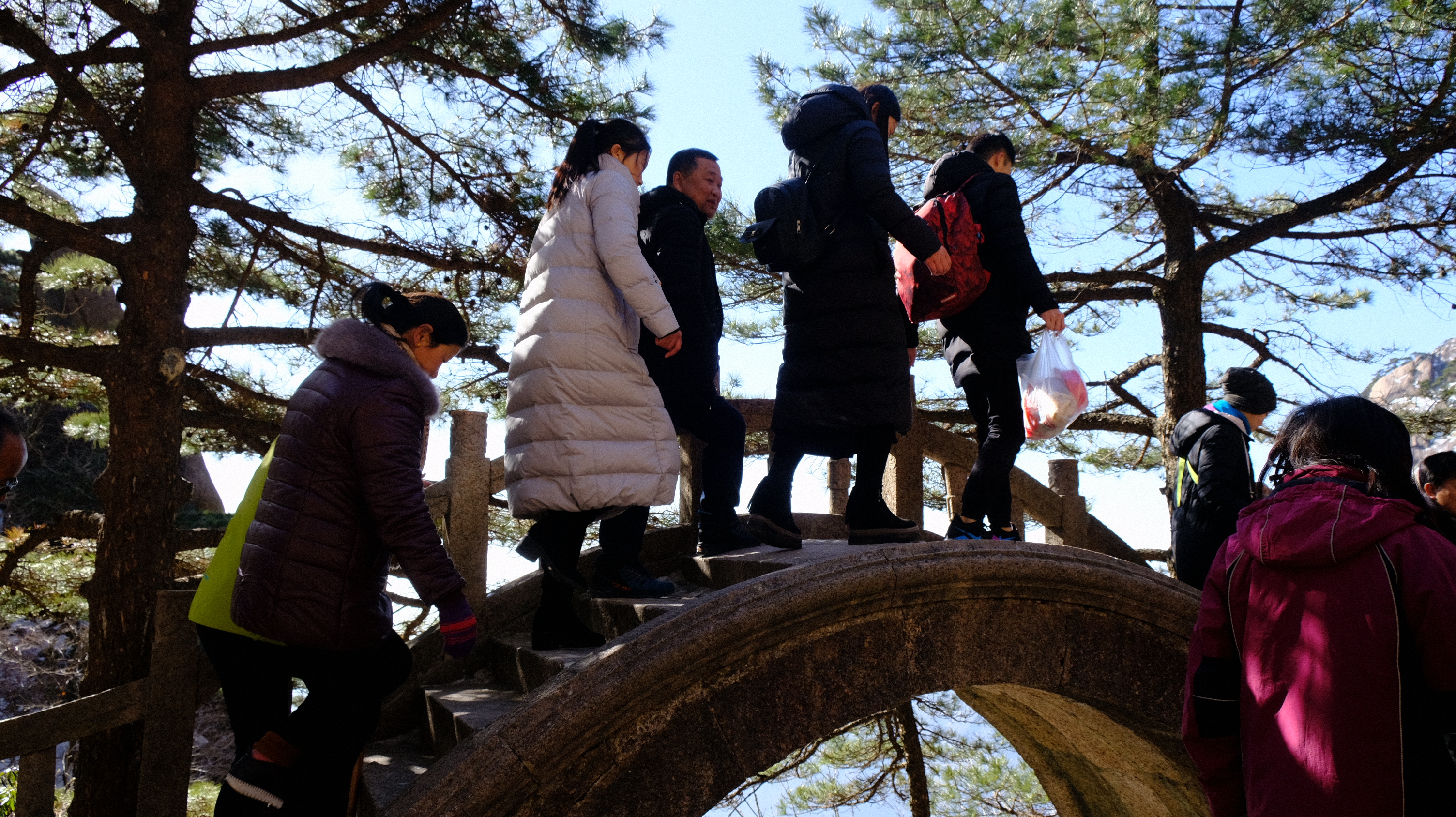 风景区过了这座小桥快到主峰,路变得更窄,上下要分流,也不好爬。