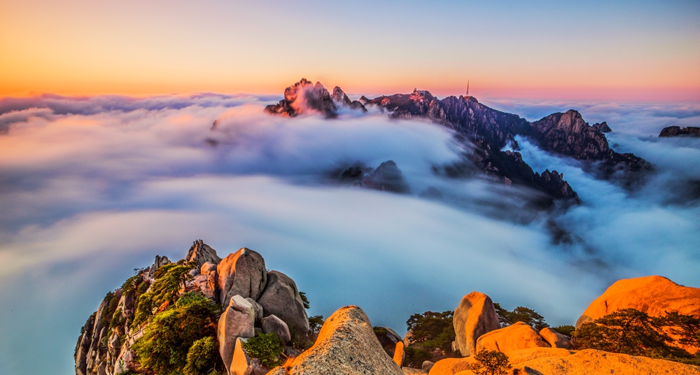 巧石奇景的最佳地点。因为西海时有云雾在山谷中升腾翻滚,扑至石亭前却又消散,故名“排云亭”。
