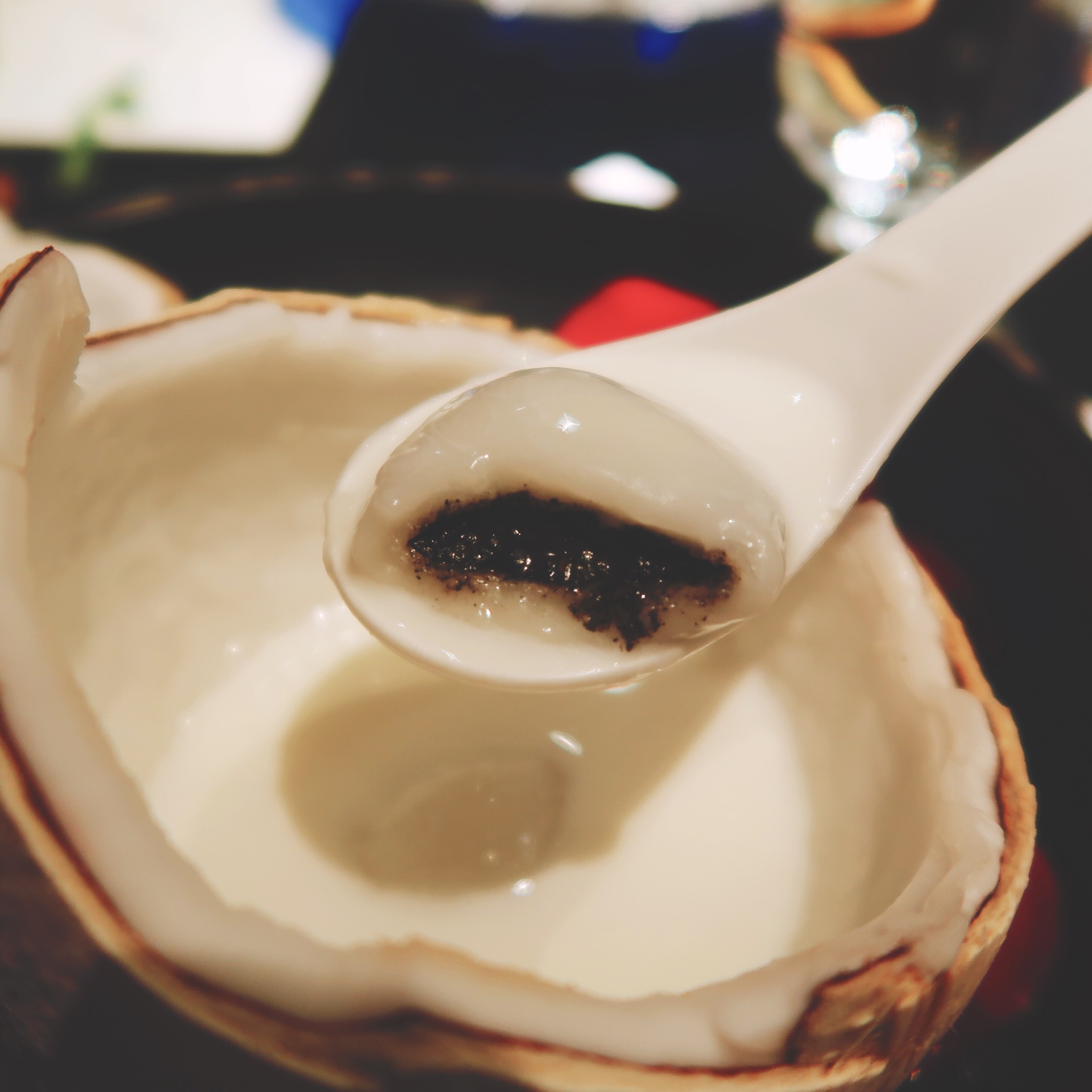 「椰汁汤圆」「椰汁汤圆」依然是长得漂亮,有仙气。味道就是椰汁的味,不是很甜,还有一些稠,所以喝起来会感觉渴还有些腻。里面的汤圆就是黑芝麻陷的。