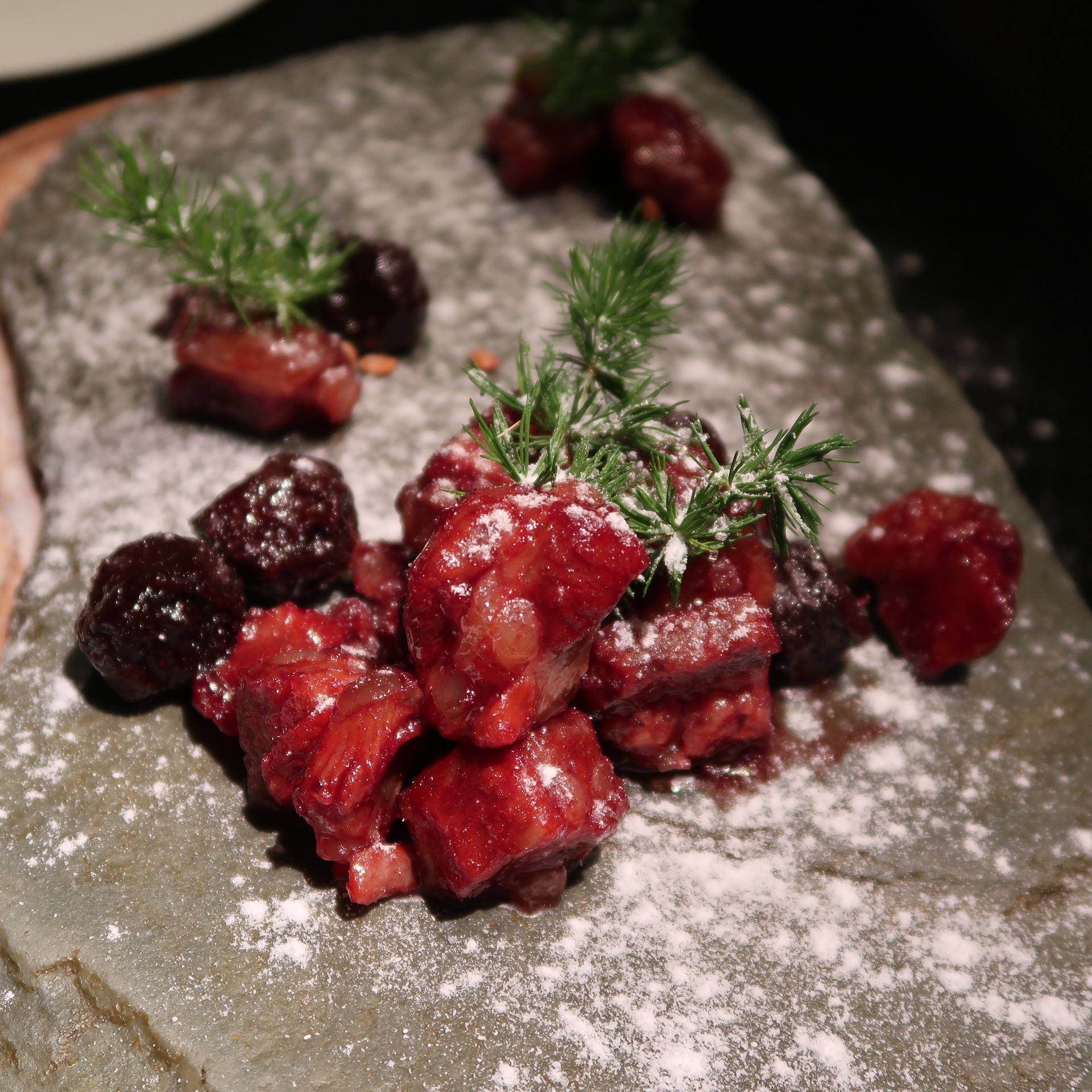 「樱桃鹅肝」「樱桃鹅肝」这个是他家招牌菜了,长得真是漂亮,鹅肝球裹上樱桃酱,打眼一看真的是分不清哪个是樱桃,哪个是鹅肝。口感还是很丝滑的,和半熟芝士差不多。至于味道我不是很喜欢,但是露说不错,我觉得鹅肝的味道完全被樱桃酱盖住了,甜不甜,咸不咸的。最终成了我们唯一剩下没吃了的菜。