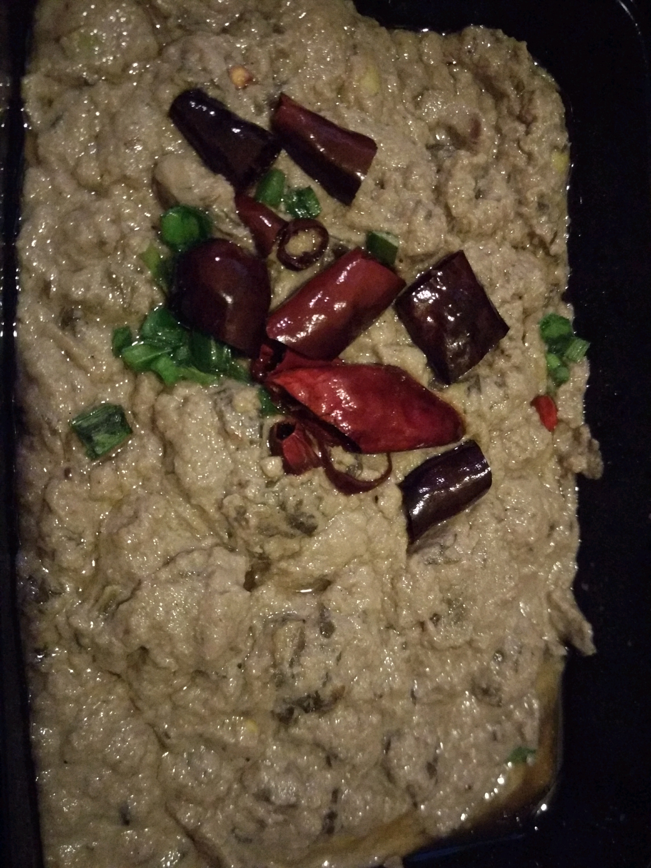 「江雪糖醋小排」「江雪糖醋小排」这个菜咱们先不说好不好吃,就是这个卖相就值得拥有了。红白黑三色的交叠,层次感很强。糖霜是服务员一边吟着孤舟蓑笠翁一边撒上去的,意境十足!说到味道,我觉得一般,太甜了,排骨完全是话梅糖的味道,可能是我不怎么吃甜食的缘故,我觉得这个菜不适合我。