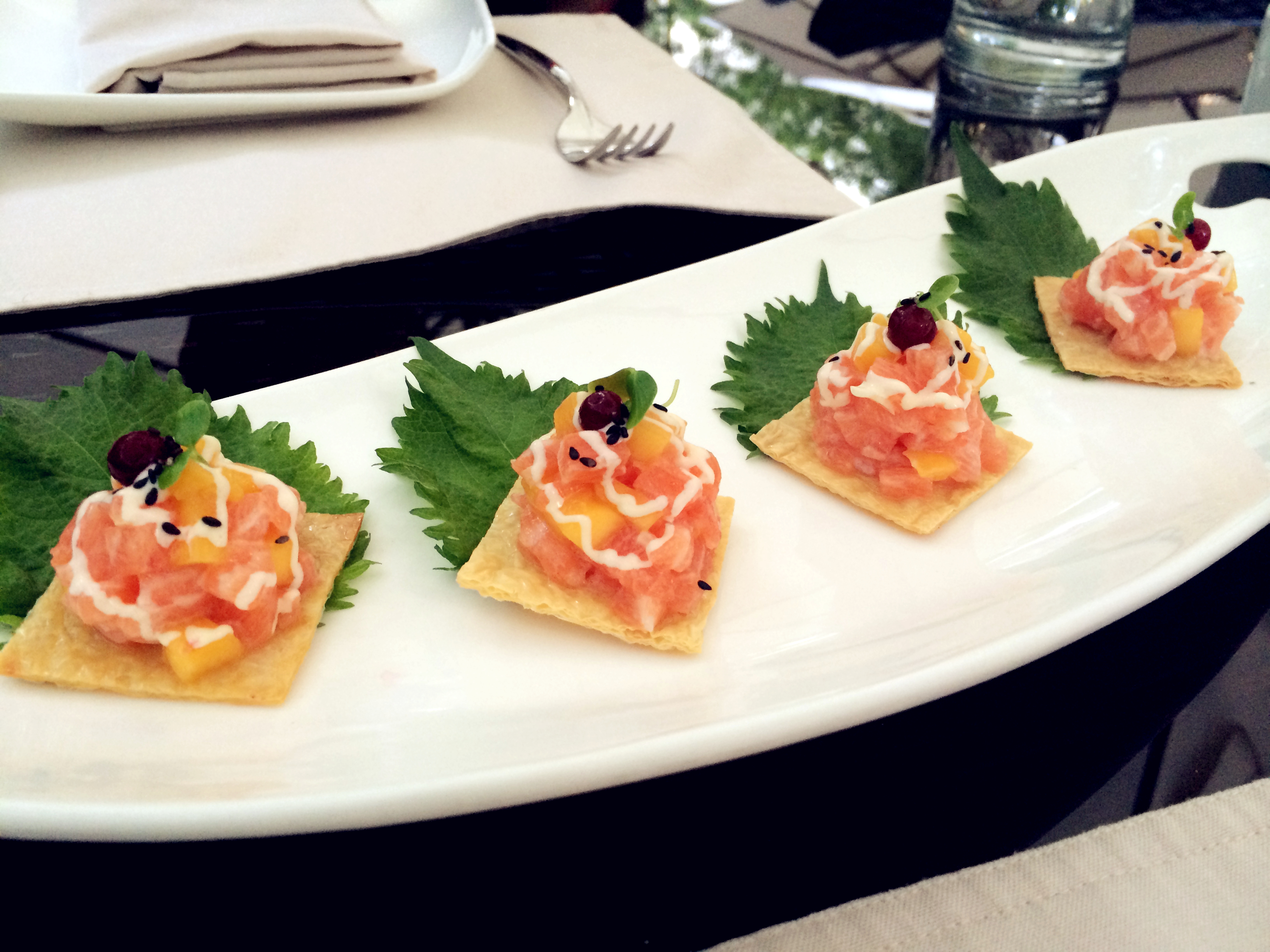创意三文鱼挞 大董烤鸭店(原 烤鸭店)成立于1985年4月28日。2001年由国营改制,总经理董振祥被朋友们昵称为大董,由此得名。向来以高端定位的大董烤鸭店也是外宾品尝烤鸭的主要去处之一。我们到的是工体富春山居店,就在工体门口,一个不起眼的门头进去后是一片偌大的草地,叫之园林也不为过。在三里屯这寸土寸金的地方,这么大的布景可谓是壕的不得了。在钢铁林立的首都,能看到这么一大片绿地真的是让人心情愉悦,大董餐厅就坐落在绿地的尽头,闹中取静,可谓派头十足。