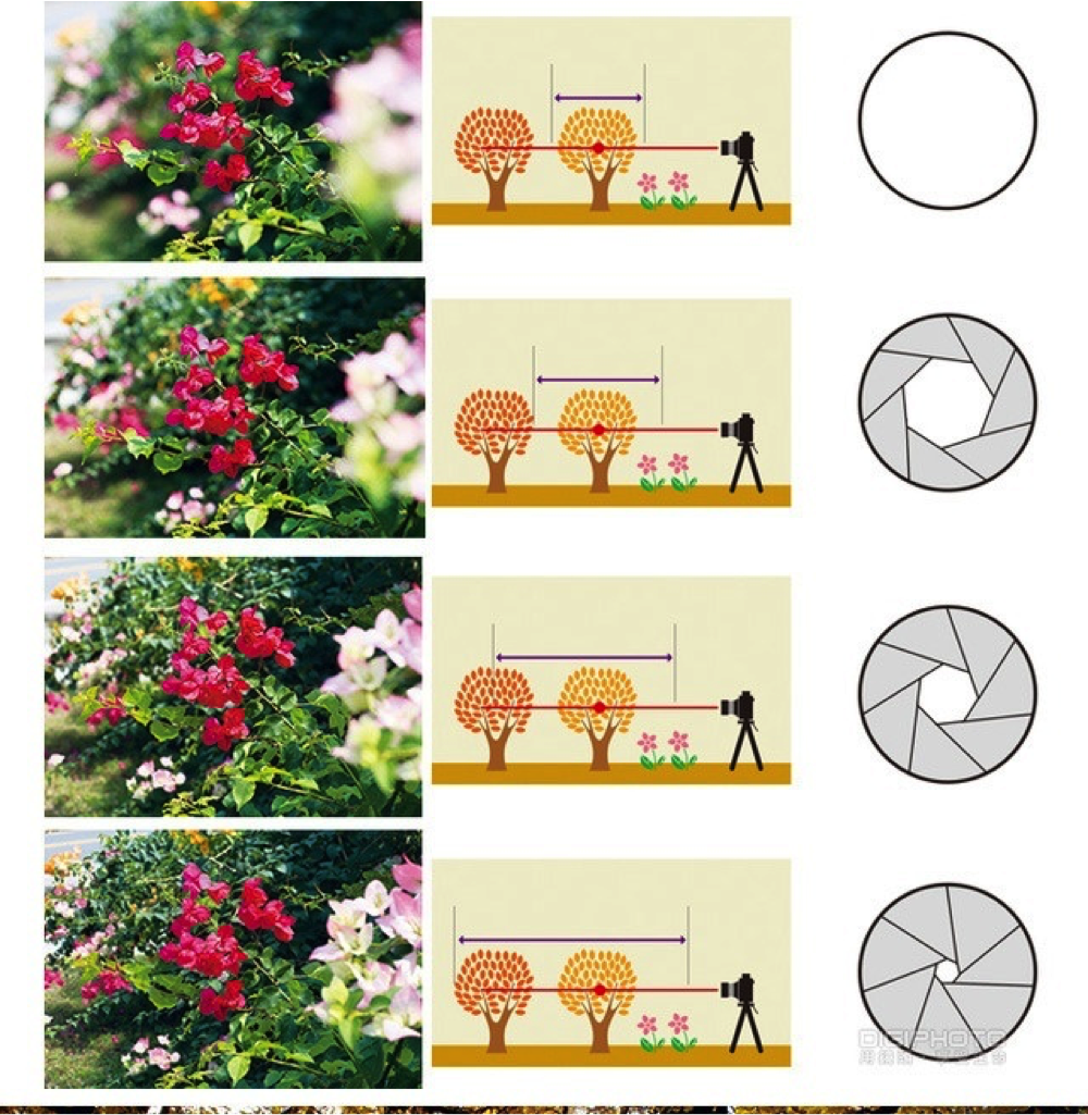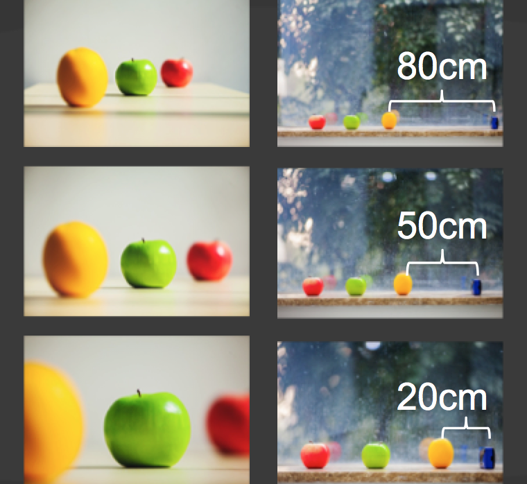 上面三张图分别是使用了相同的光圈和焦距,相机和拍摄物体的距离分别是20mm,50mm和80mm三个不同的距离去拍摄的,由此可见:距离越长,景深越小;焦距越短,景深越大。
