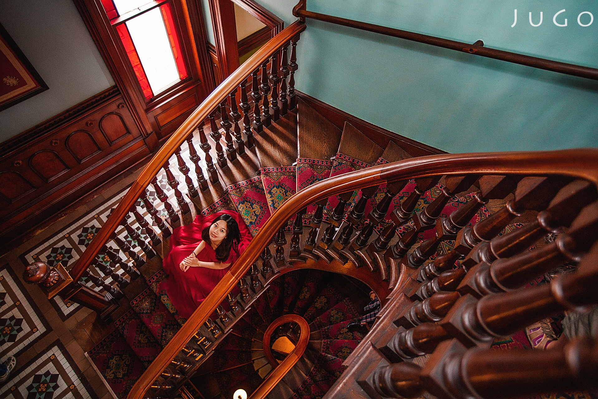 用城堡里的旋转楼梯作为引导线,将观者视线引导到人物。